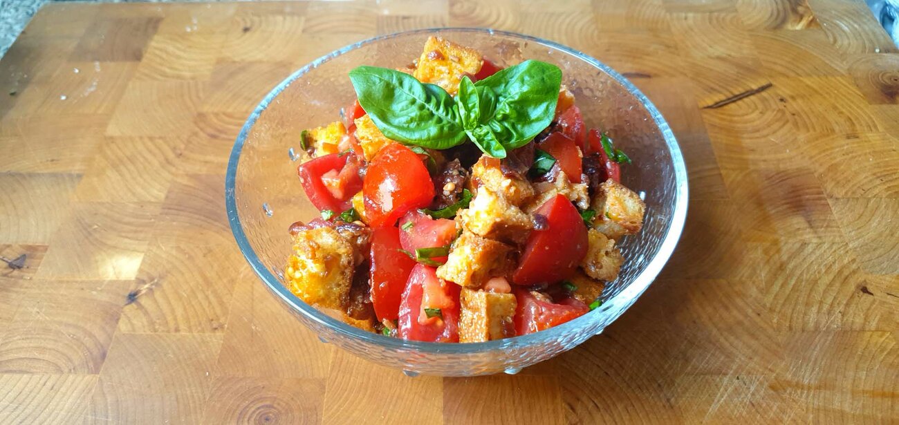 Nun Tomaten je nach Größe schneiden (etwa so groß wie die Brotwürfel). Den Basilikum in feine Streifen schneiden.