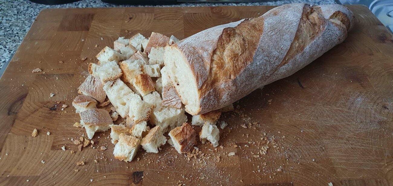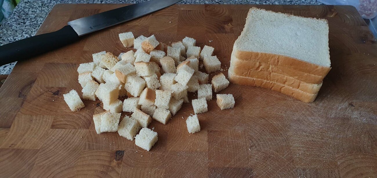 Brot in ca. 1x1 cm große Würfel schneiden. Die weißen Zwiebeln fein würfeln.