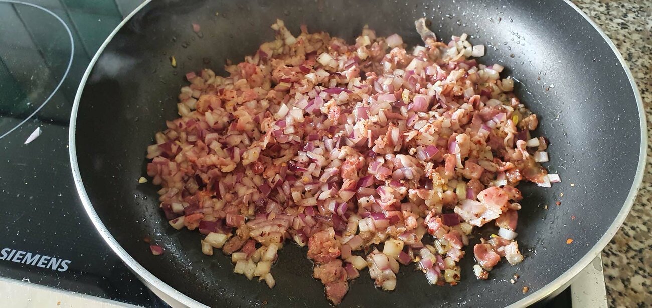Anschließend den Speck in Streifen schneiden und in Olivenöl rösten. Zwiebeln fein würfeln und mit dem Speck rösten. Mit Rotwein und dem Essig ablöschen und einköcheln lassen, bis es ein wenig dickflüssig wird.