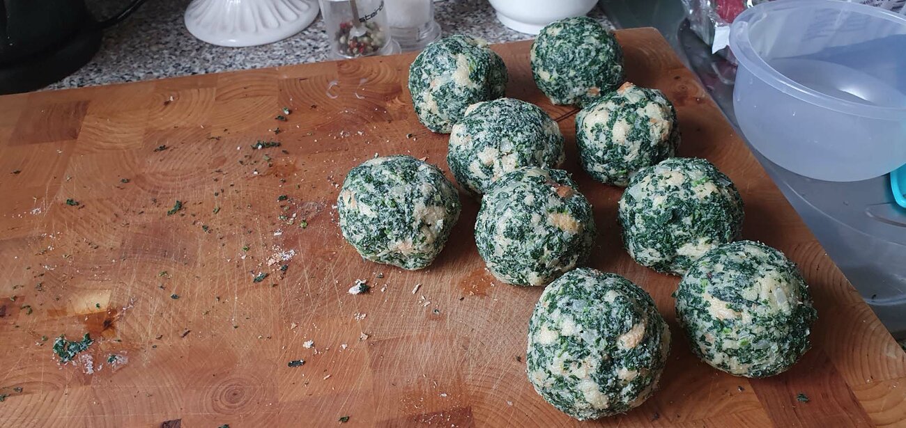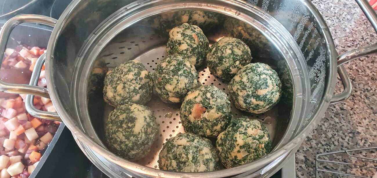 Die Knödel jetzt gleichmäßig formen (ca. 5 cm im Durchmesser). Ich dämpfe meine Knödel am liebsten über einer leichten Gemüsebrühe ca. 20 min. Tipp: Ein bisschen Abstand zwischen den Knödeln lassen, da sie noch aufgehen.