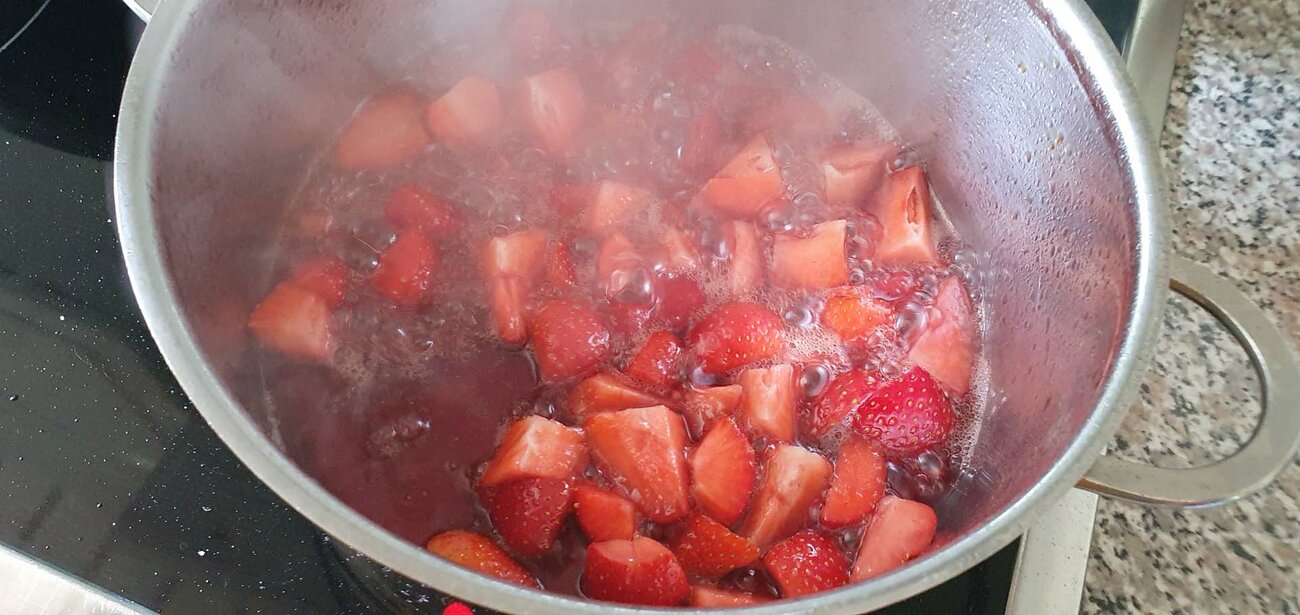 Für das Kompott Erdbeeren waschen und putzen, dann würfeln. Etwas Zucker (2 EL) leicht karamellisieren, mit Rotwein (150 ml) ablöschen, 1/3 der Erdbeeren dazu und kurz köcheln lassen, dann mixen. Nun die restlichen Erdbeeren dazugeben und ziehen lassen.