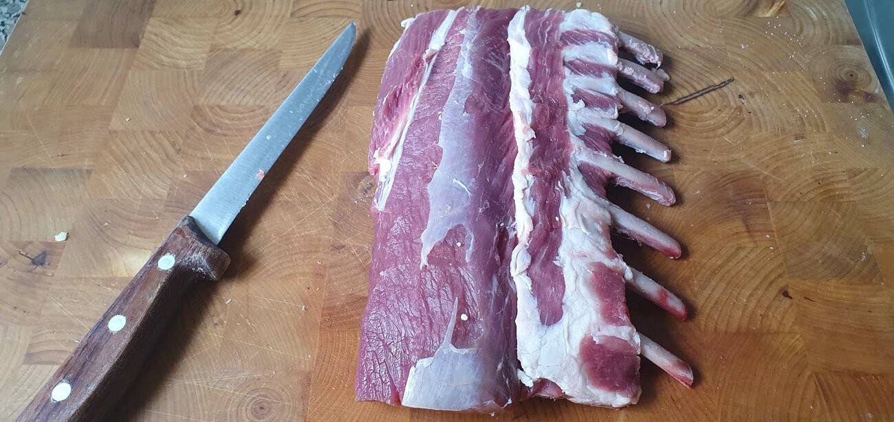 Vom Lammkarree das grobe Fett und die Sehnen abputzen.