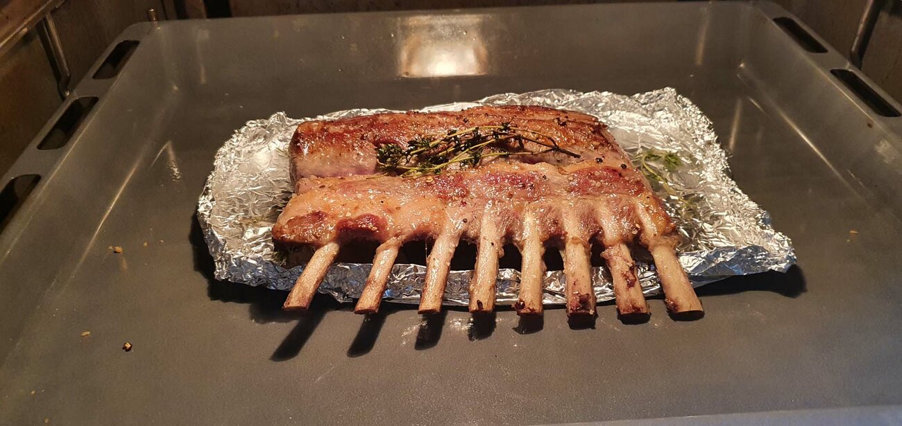 Nun das Lammkarree auf ein Blech im Ofen bei 160° C ca. 15 min fertig backen und vor dem Aufschneiden noch 5 min rasten lassen.