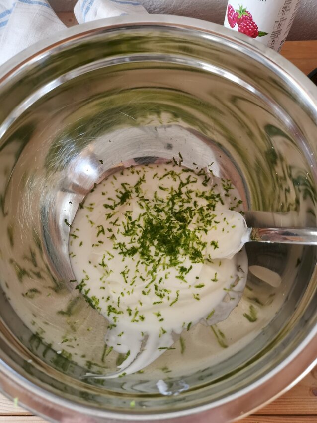 2. Topfen, Joghurt, Honig und Limetten-Zesten und -Saft miteinander vermengen.