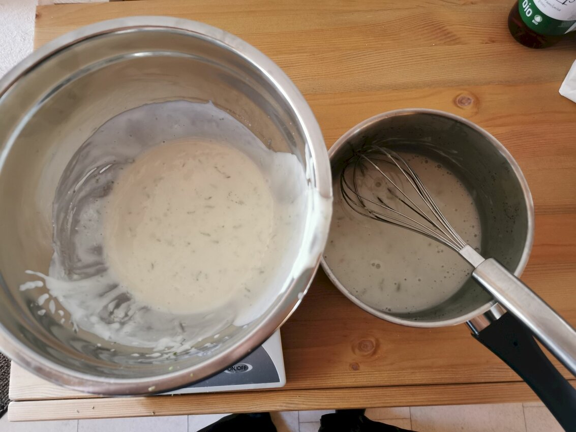 3. Anschließend Gelatine leicht aufwärmen und vorsichtig mit der Joghurt-Topfen-Masse angleichen.