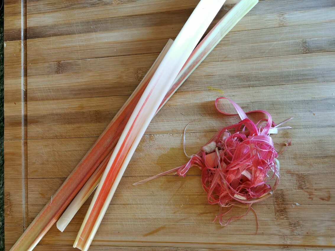Rhabarber leicht schälen. Du musst nicht die komplette rote Schale entfernen, da diese nach dem Kochen sehr weich ist.
