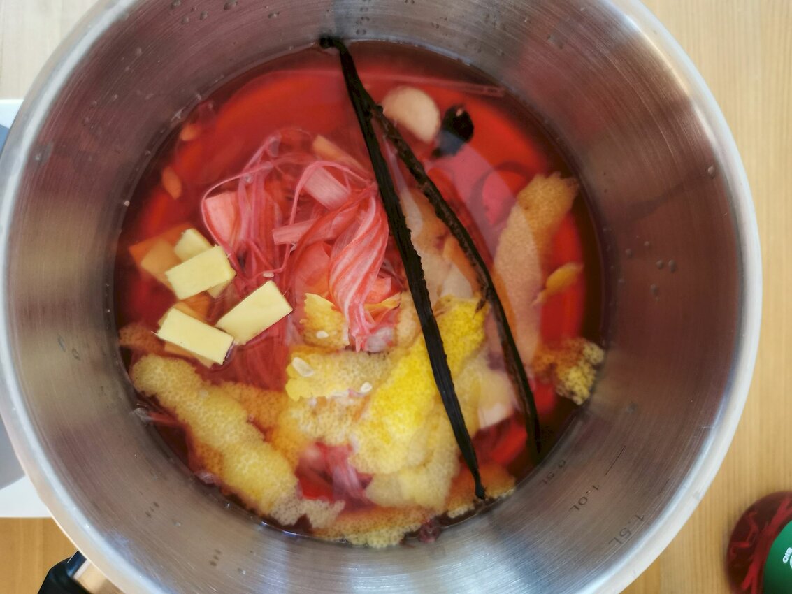 Alle Zutaten gemeinsam mit den Schalen (diese verleihen dem Sud eine schöne rosa Farbe und einen herrlichen Geschmack) zu einem Rhabarber-Sud kochen und eine ½ Stunde ziehen lassen. Anschließend durch ein Sieb passieren.