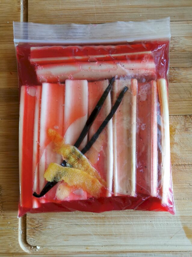 Schneide nun die Rhabarber-Stangen in gleich große Stücke und gib diese in einen Gefrierbeutel. Die Sud-Flüssigkeit hineingeben (Vanille und Zitronenschale dürfen darin baden), gut verschließen und etwa 3-4 Minuten in bereits siedendem Wasser köcheln lassen.