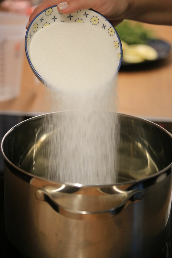 Wasser und Zucker in einem Kochtopf unter Rühren erhitzen, bis sich der Zucker aufgelöst hat.