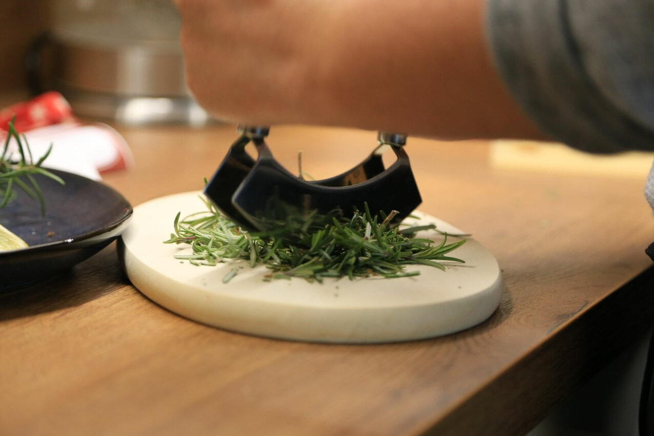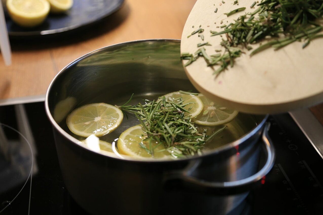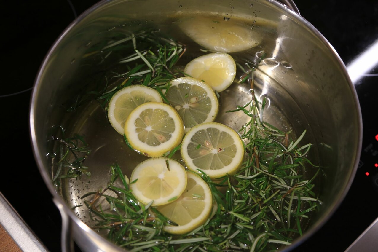 Die in Scheiben geschnittenen Zitronen und den etwas zerkleinerten Rosmarin dazugeben und kurz köcheln lassen.
