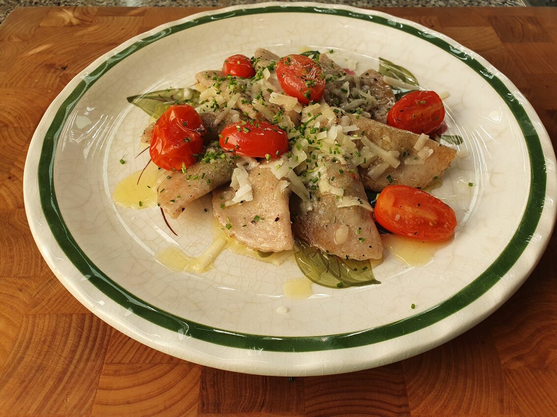 In einer großzügigen Pfanne die Schlutzkrapfen in der Hälfte des Butterschmalzes anschwitzen, aber nicht braten, sonst wir der Teig hart. Die Cherrytomaten halbieren und dazugeben.