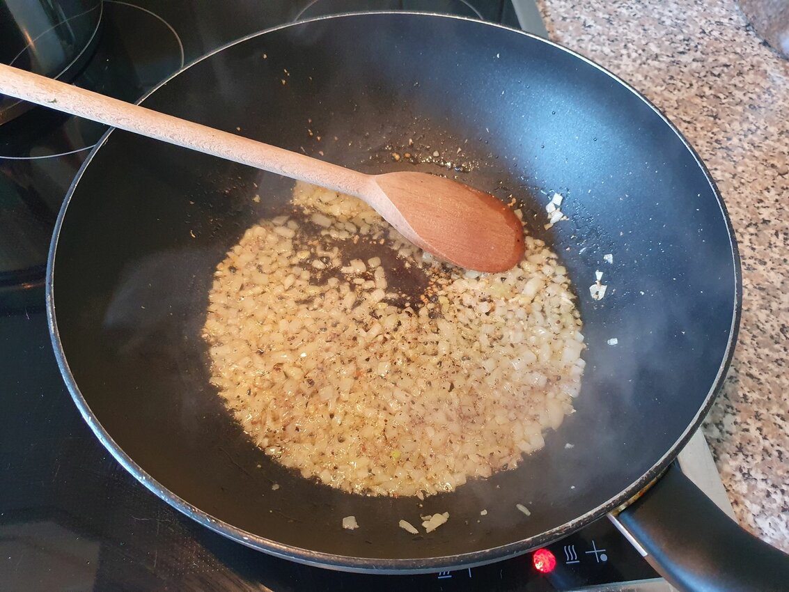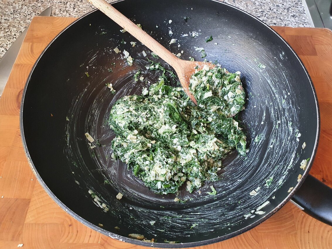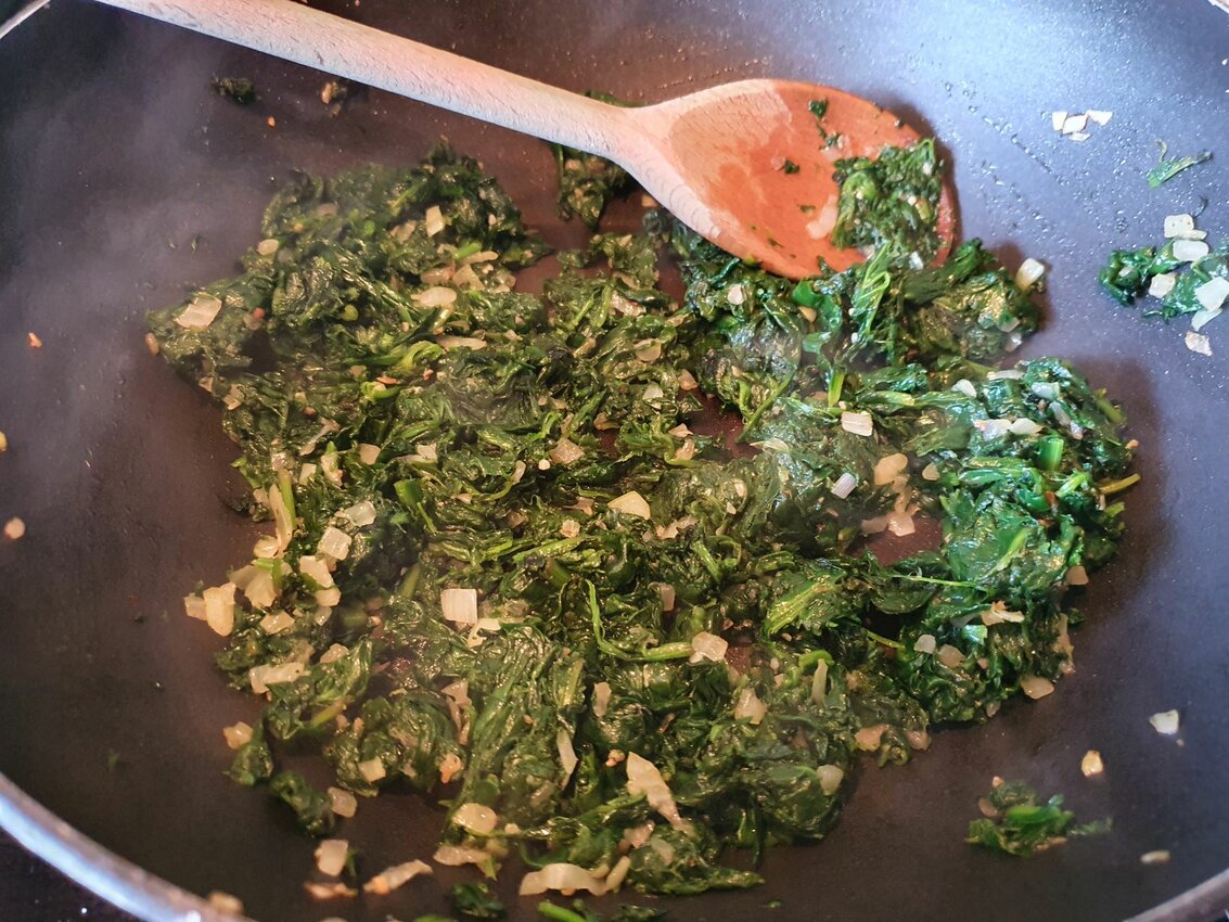 Tipp: Ich gebe in dieser Phase gerne schon die Gewürze dazu, da sie so intensiver schmecken. Zudem nutze ich gerösteten, statt frischen Knoblauch, weil der frische Knoblauch schnell an Geschmack verliert. Nun den Spinat zugeben und kurz anschwitzen.