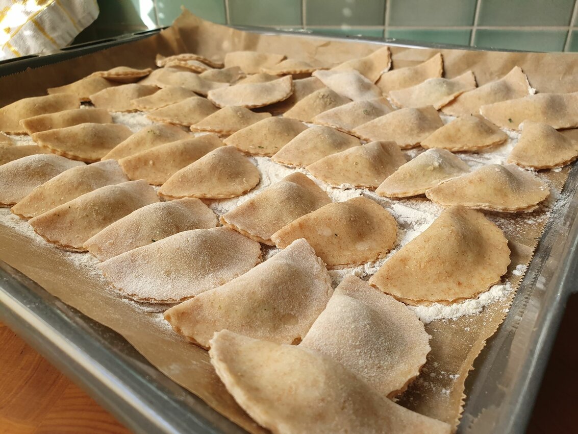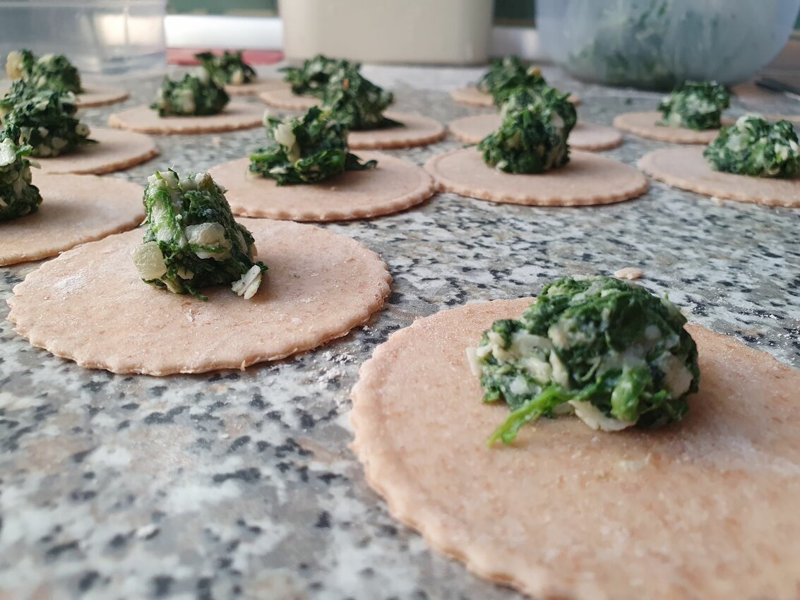 Anschließend mit einem Teelöffel die Spinatmasse in die Mitte geben. Den Rand mit etwas Wasser befeuchten und über die Mitte zusammenklappen, dabei darauf achten, dass die Taschen gut geschlossen sind, sonst tritt beim Kochen Wasser hinein und sie gehen auf.