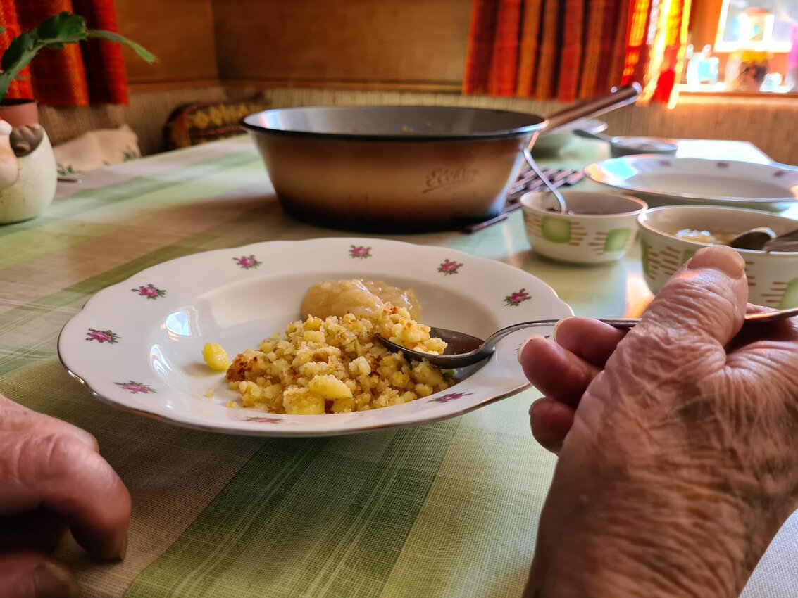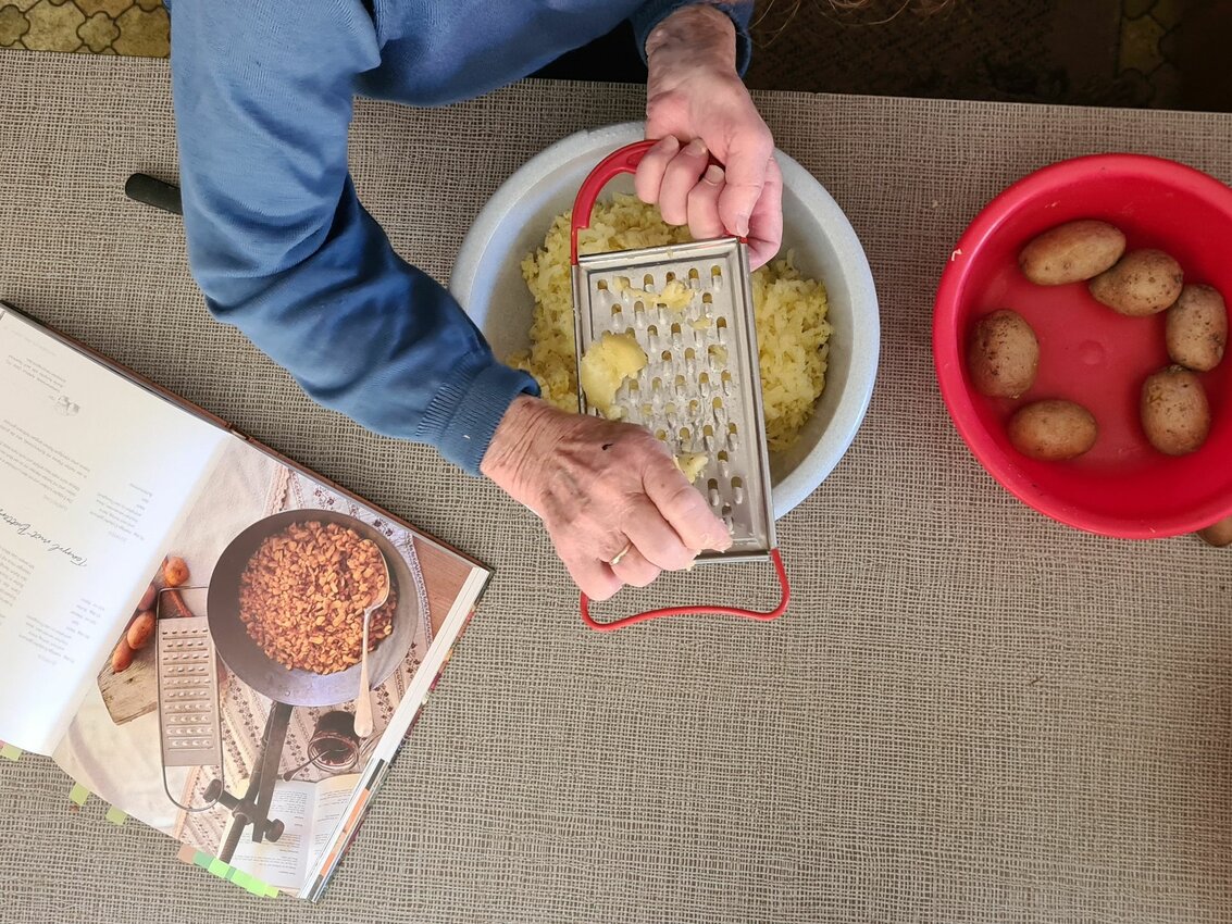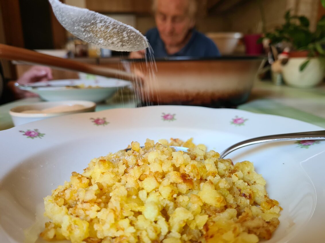 Heute koche ich ein leckeres Rezept aus dem Fisser Kochbuch: einen Tearpl, auch Erdäpfelriebler genannt. Die Kartoffeln sind aus meinem eigenen Acker und auch das Schmalz habe ich selber hergestellt. Besonders gut wird das Bauerngericht in einer gusseisernen Pfanne.