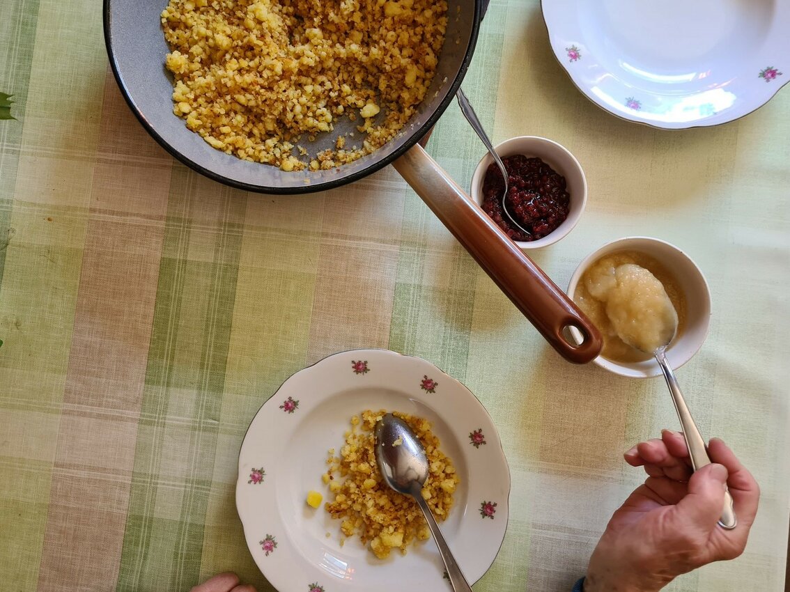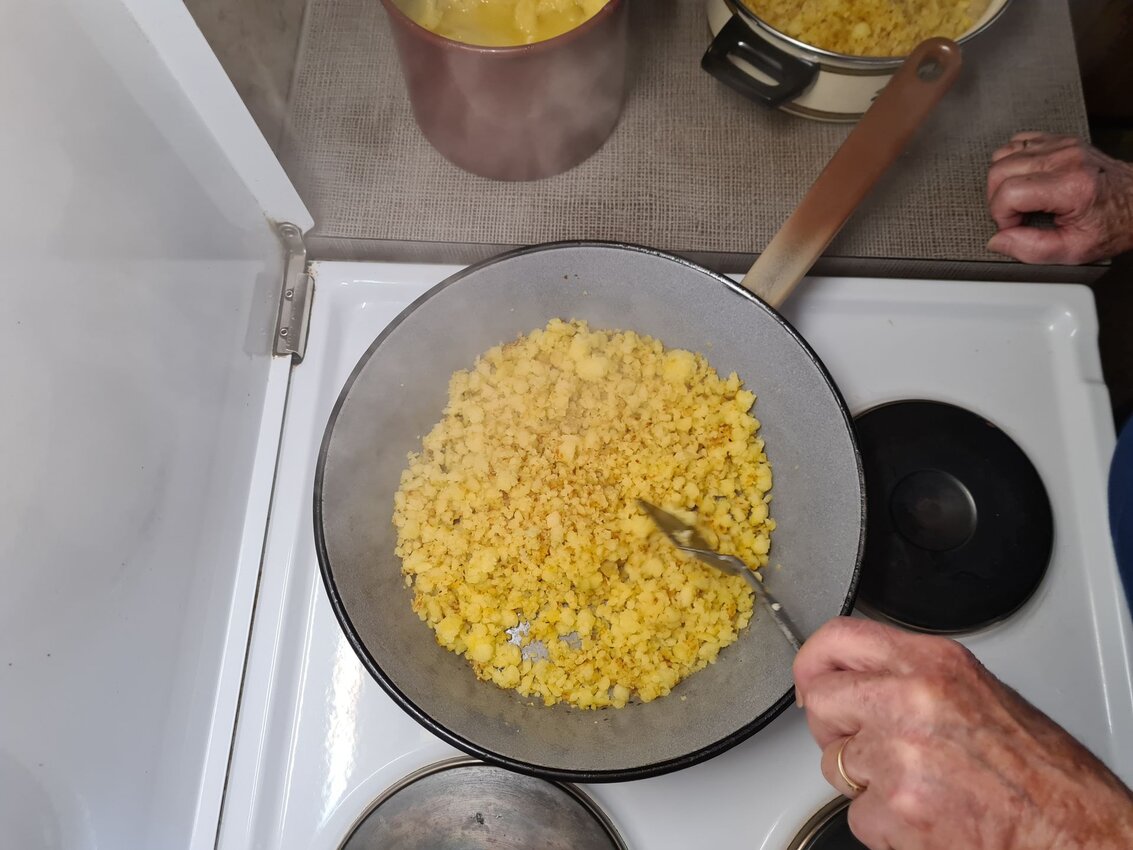 - Die zwei Grundzutaten sind gut vermischt und werden nun in der Pfanne geröstet. Gib dazu reichlich Butterschmalz in eine Pfanne.