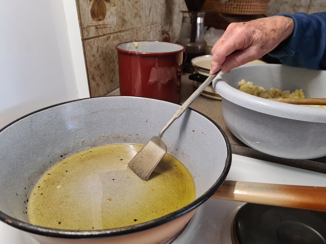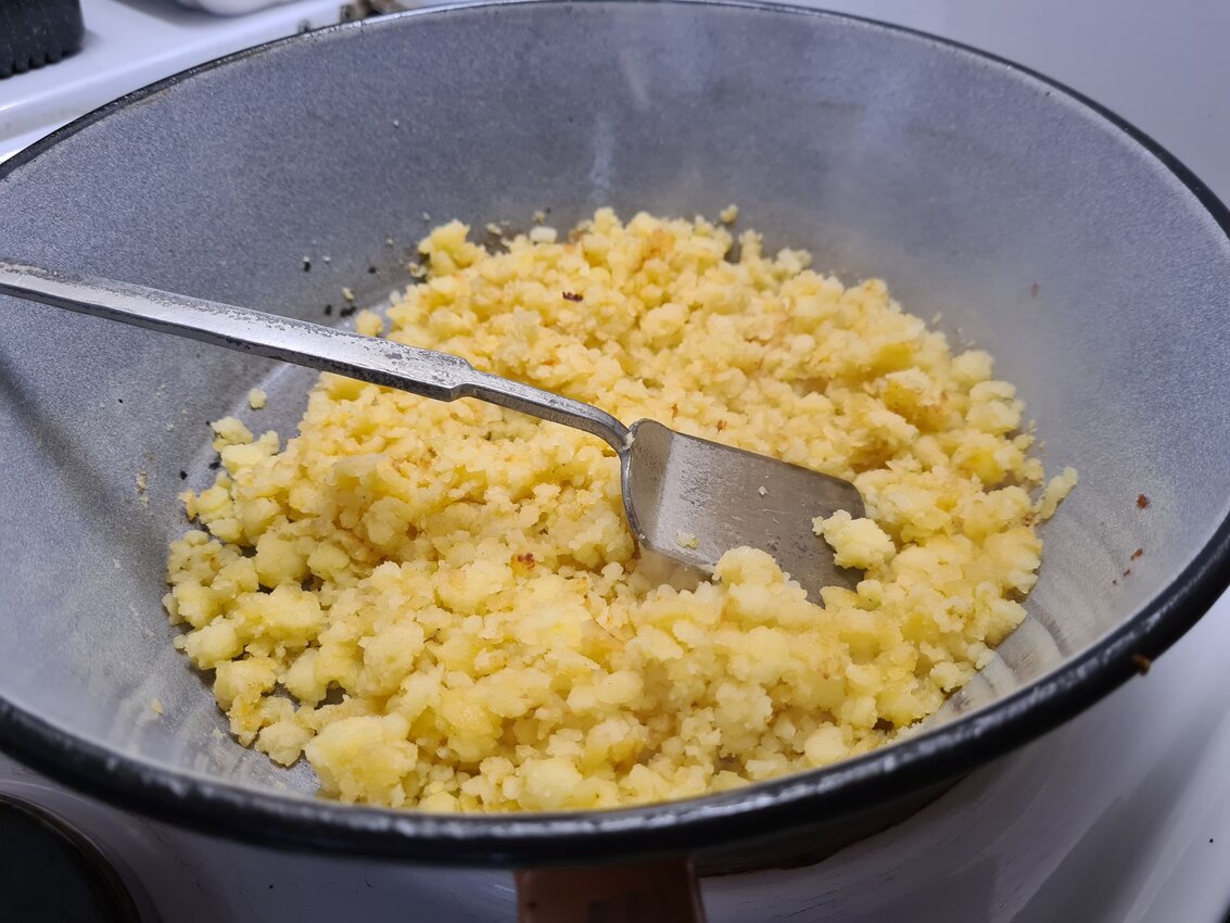 - Wenn das Schmalz langsam zu rauchen beginnt, kannst du die Erdäpfelmasse hinzugeben.