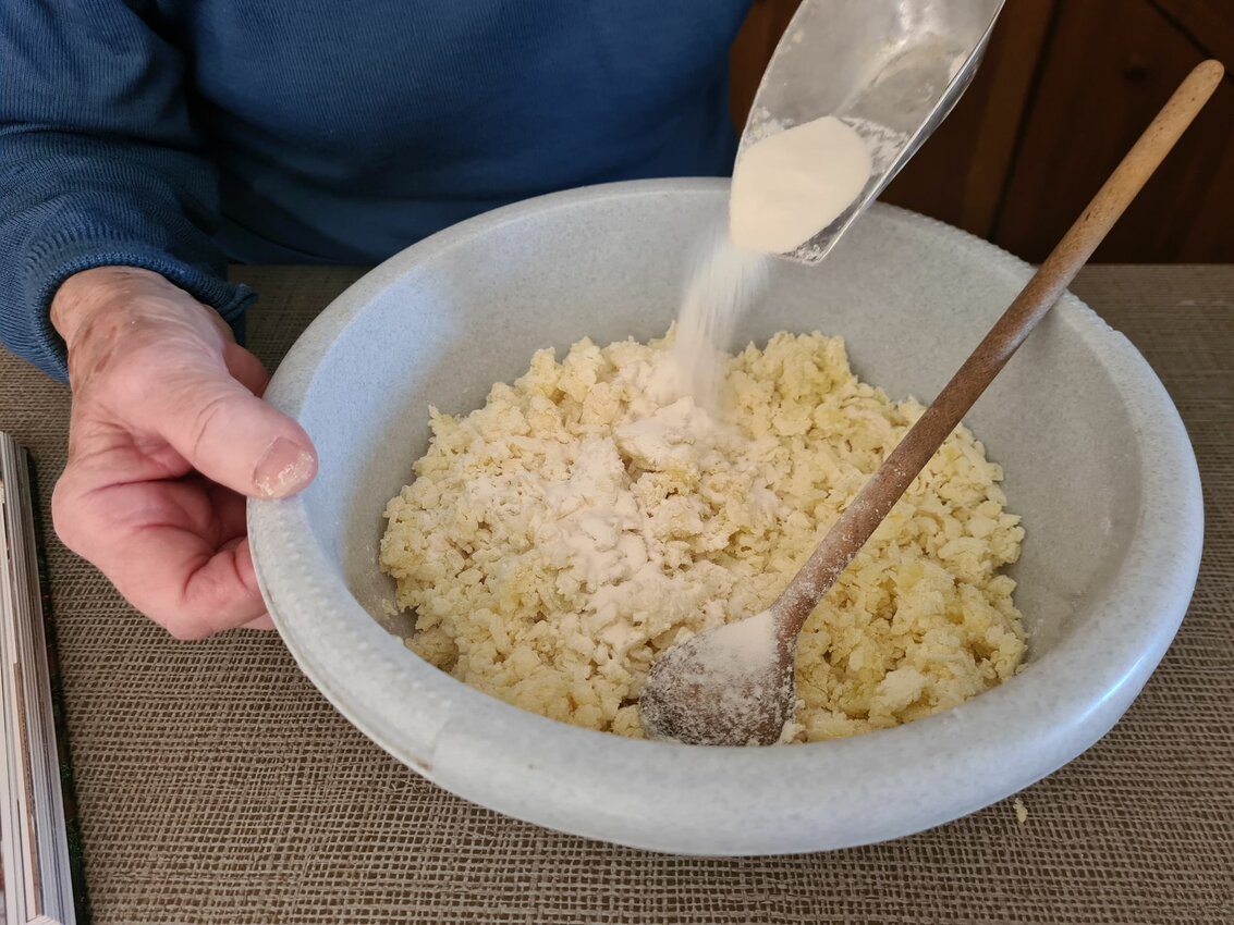 - Die zweite Hauptzutat ist das Mehl. Doppelgriffiges verwende ich für den Tearpl. Nun gibst du so viel Mehl in die Schüssel, bis sich die Masse nicht mehr nass anfühlt und nicht mehr klebt. Ich rühre die Masse mit einem hölzernen Kochlöffel um. Du kannst aber auch beide Hände nehmen und die Kartoffeln mit dem Mehl verbröseln. Tipp: Du brauchst viel Mehl. Je öfter du das Gericht zubereitest, desto mehr Gefühl bekommst du für das Mengenverhältnis.
