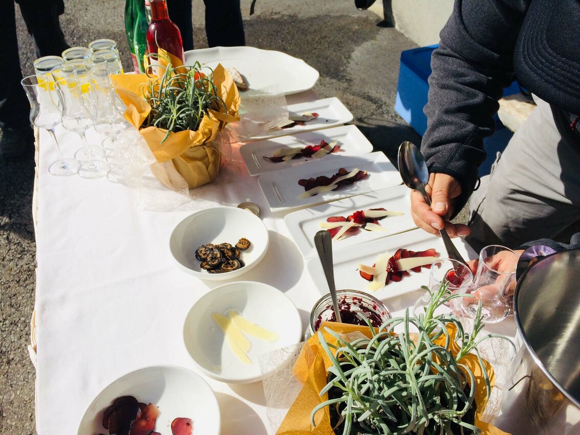 Ein reich gedeckter Tisch vor der Alpe mit weißer Tischdecke strahlte mit der Sonne um die Wette. Allerlei Spezialitäten-Häppchen wurden direkt vor Ort von Mike hübsch auf den Tellern angerichtet und den Teilnehmern gereicht. Das selbstgebackene Brot mit Grammelschmalz sowie der zarte Hirschrücken, der g‘schmackige Almkäse, das süße Zwiebelconfit und die grünen Walnüsse machten der Bezeichnung „Schmankerl-Wanderung“ alle Ehre. Ein gelungener Start – da waren sich alle Teilnehmer schnell einig!