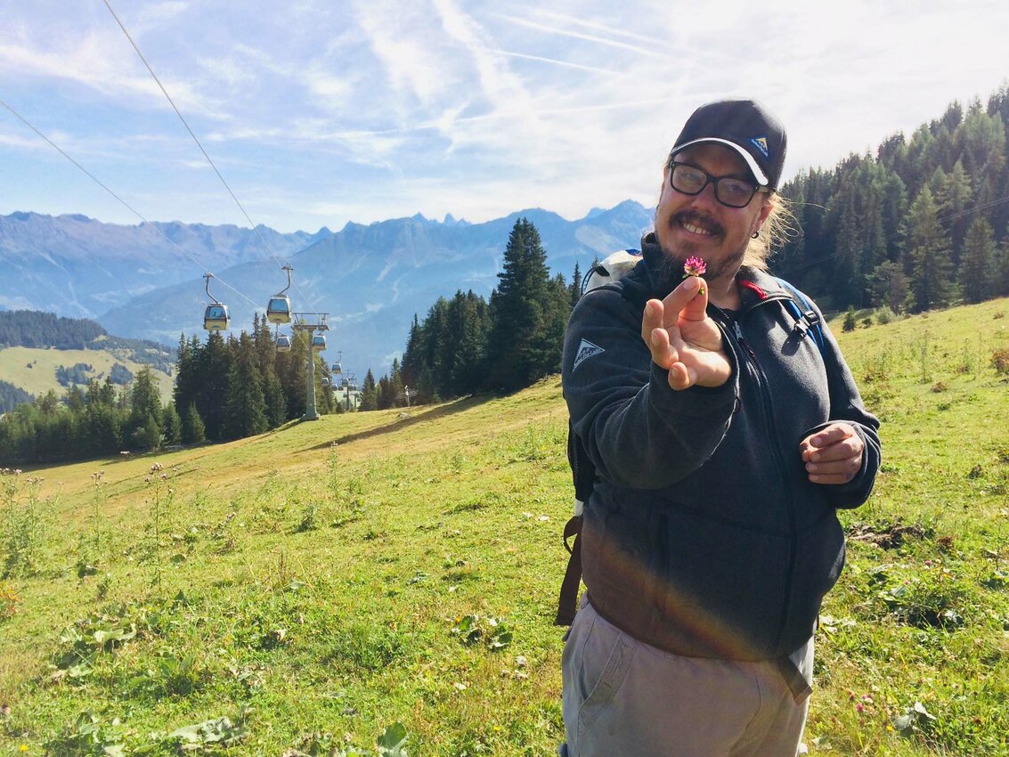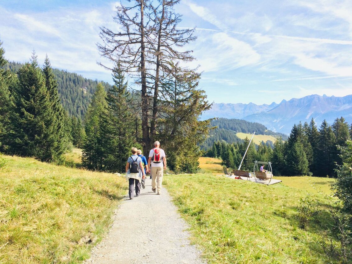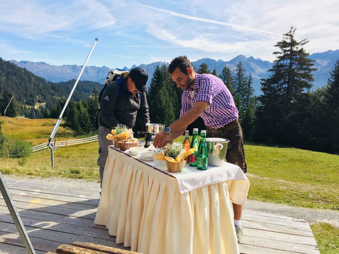 Die Sonne kitzelte unsere Nasen, als wir bei der Bergstation der Komperdellbahn auf unsere Wanderbegleitung warteten. Pünktlich um halb elf schüttelte uns der gut gelaunte Mike, Küchenchef des Leithe Wirtes und Ideengeber der Schmankerl-Wanderung (gemeinsam mit Restaurantleiter Peter Mangott), die Hand und wir machten uns sogleich auf den Weg Richtung Leithe Wirt. Unsere Mägen knurrten bereits. Hungrig sollten wir nach dieser kulinarischen Wanderung jedoch mit Sicherheit nicht bleiben. Dafür sorgte Mike und sein Gehilfe Florin, der die Köstlichkeiten zu unseren Kulinarik-Stopps per Vierrad lenkte.