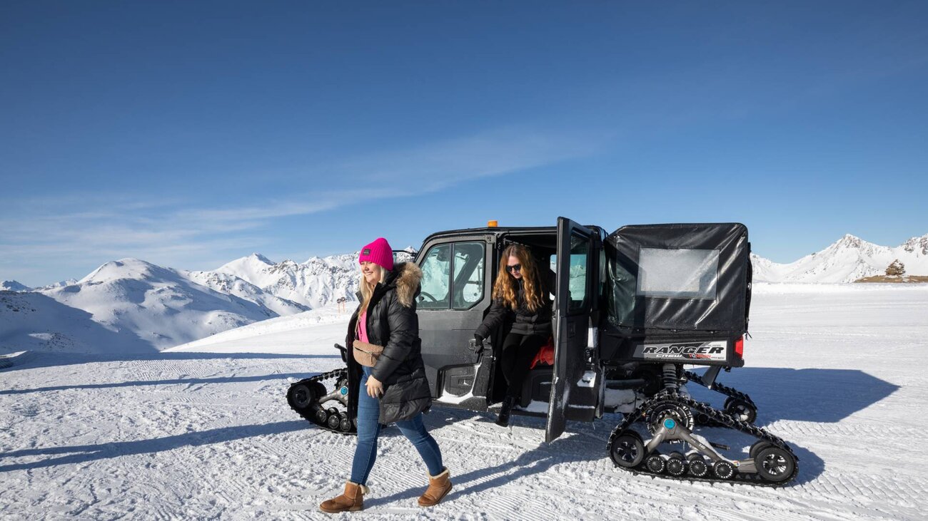 Dafür gibt es extra den Polaris Ranger, ein kleines Snowmobil, das auch uns vom Panoramarestaurant BergDiamant an der Bergstation der Schönjochbahn zum Crystal Cube befördert hat. Das Schneegefährt bietet Platz für 5 Personen und ist eine großartige Alternative für all jene, die nicht mit Skiern oder Snowboards unterwegs sind.