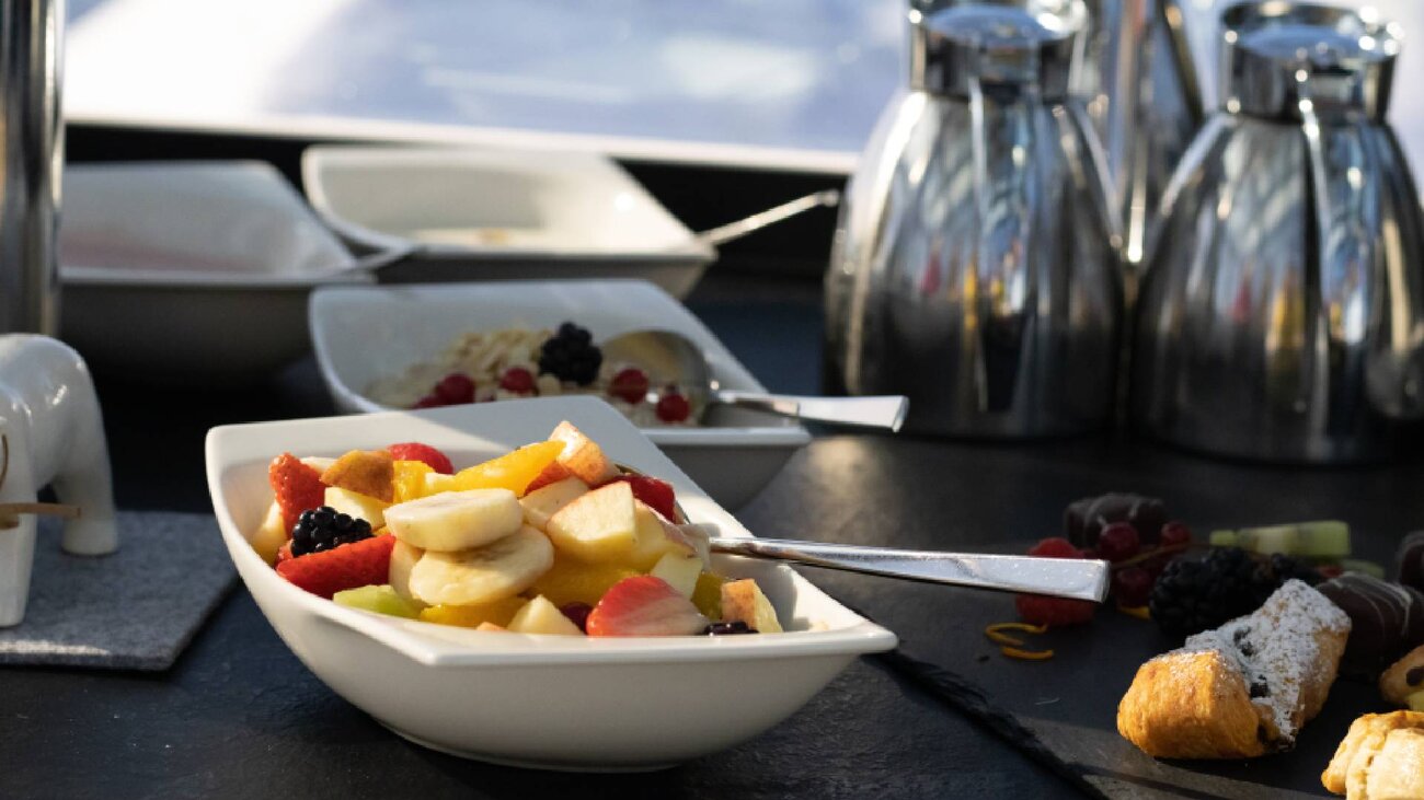 Außerdem hatten wir noch zur Auswahl: frisch gepresster Orangensaft, verschiedene Säfte, Vanillegebäck, Nussschnecken, warme Milch oder warmer Kakao, verschiedene Käse- und Wurstsorten, Müsli, Nutella, Marmelade, verschiedene Brotsorten, Gemüsesticks mit Kräuterquark-Dip, frisches Obst und unterschiedliche Joghurtsorten. Ich glaube, jetzt wird wirklich deutlich, dass ich mit „es wurden KEINE Wünsche offengelassen“ nicht übertrieben habe.