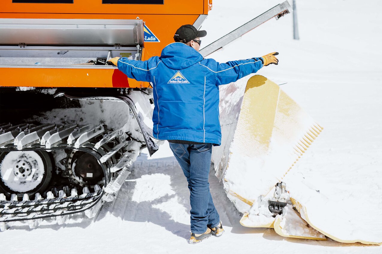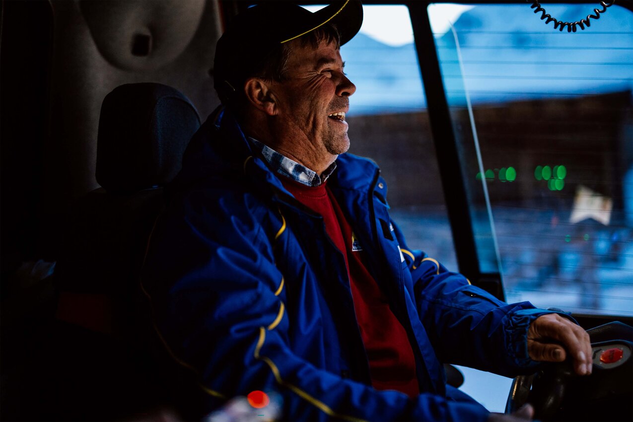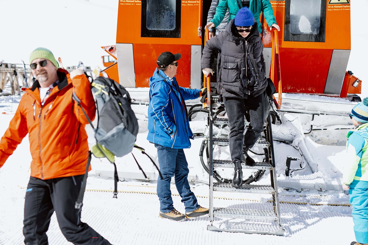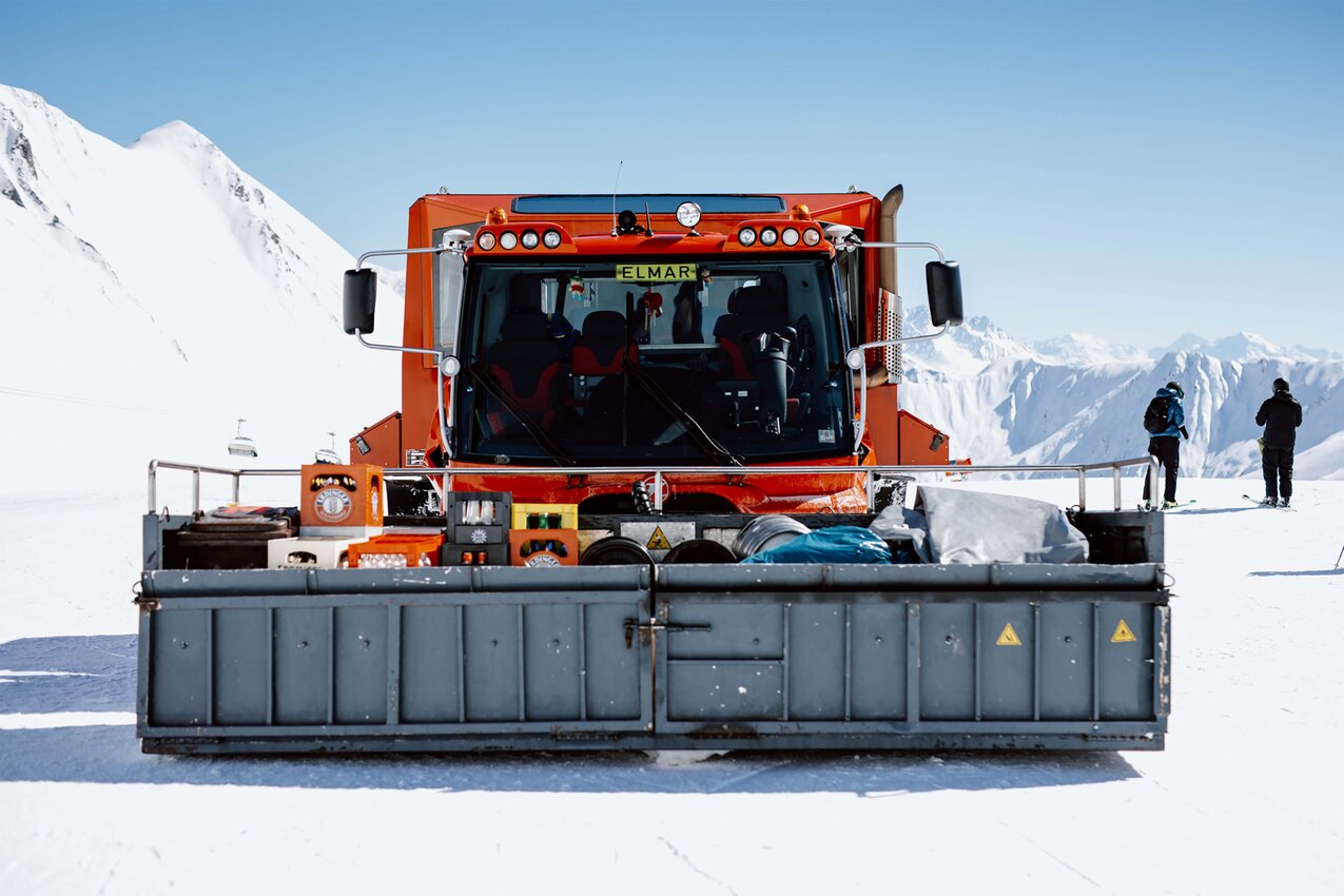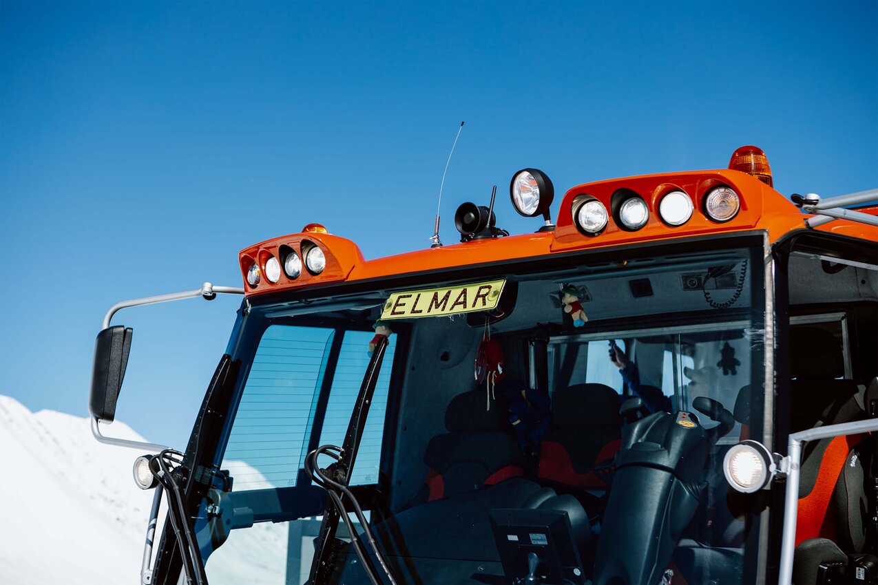 Sein Arbeitsgerät, die zum Masner Express umgebaute Pistenraupe, bringt bis zu 16 Gäste auch ohne Ski vom Tal oder von der Bergstation der Lazidbahn aus in den Masner und zurück. Je nach Abfahrtsort dauert die Fahrt bis zu einer Stunde. Zusätzlich beliefert Elmar bei seinen Fahrten die Restaurants im Skigebiet, holt Müll ab und an diesem Tag nimmt er sogar ein Paket mit auf seine Fahrt. Paketdienst im Skigebiet? „Nein, das war eine Ausnahme“, sagt er. Seine Arbeitstage beginnen früh und enden spät: Wenn die wöchentliche Sonnenaufgangsfahrt Sunrise Hexensee ansteht, starten seine Tage mitunter schon um Viertel vor fünf Uhr. Bringt er die Gäste vom exklusiven Sunset Dinner Masner zurück ins Tal - so wie am Tag des Interviews – dann endet seine Arbeitszeit erst gegen halb zehn Uhr abends.
