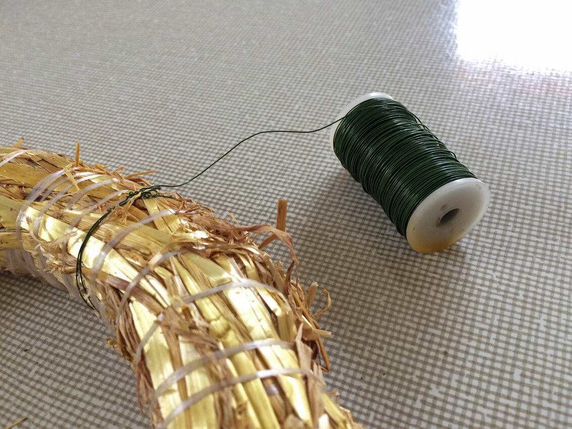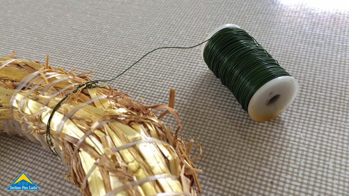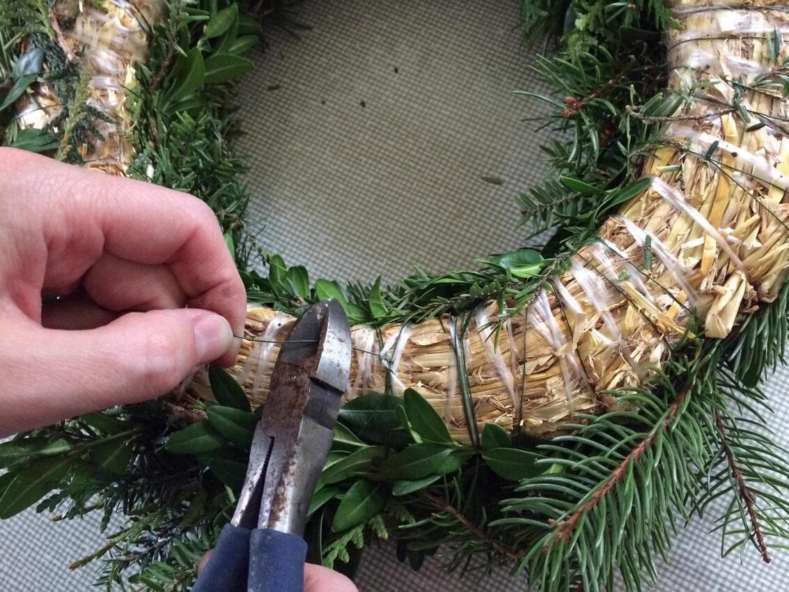 Am Ende der Bündelarbeiten wird es dann etwas knifflig. Das letzte Bündel unter das erste stecken, damit nicht sichtbar ist, wo sich der Anfang und das Ende des Kranzes befinden. Anschließend mit Draht befestigen und den Kranz umdrehen. Wie mit Nadel und Zwirn das Drahtende auf der Unterseite des Kranzes verknoten und abzwicken.