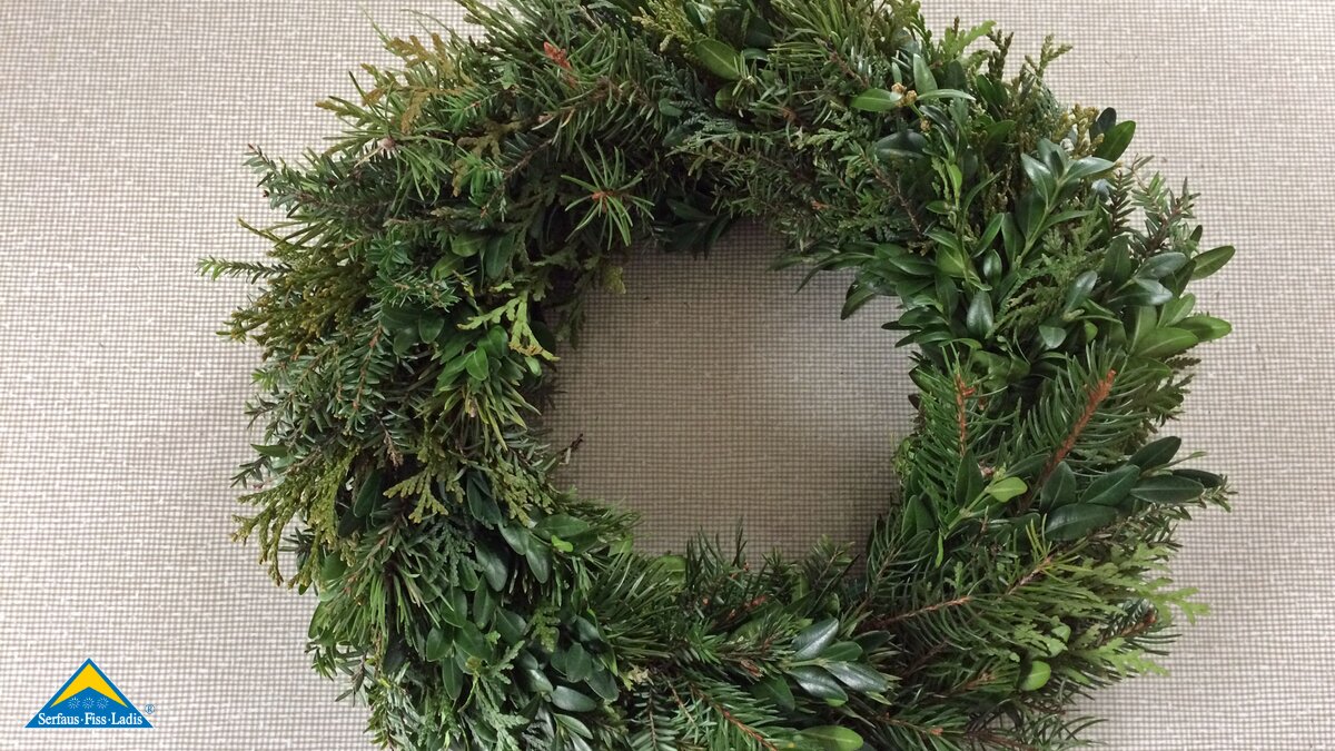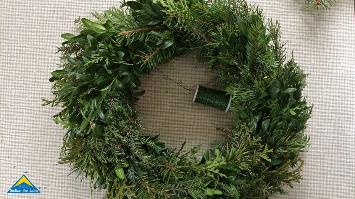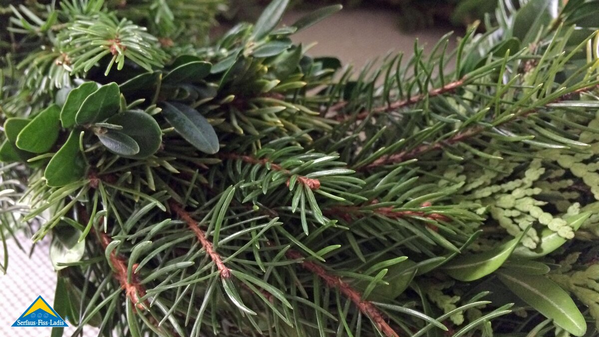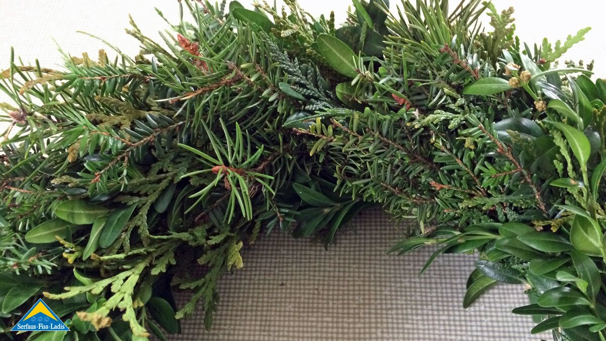 Hier sind der Kreativität keine Grenzen gesetzt. Gemischtes Grün macht sich gut. Gerne kann hier natürlich ganz klassisch mit Tannengrün gearbeitet werden. Ich bevorzuge aber das Spiel mit unterschiedlichen Strukturen und Farben. Neben den klassischen Tannenzweigen nahm ich Buchs-, Föhren und auch Thujenzweige. Die Länge der Zweige ist Geschmackssache. Je länger die Zweige sind, umso buschiger wird der Kranz.