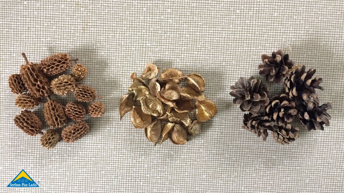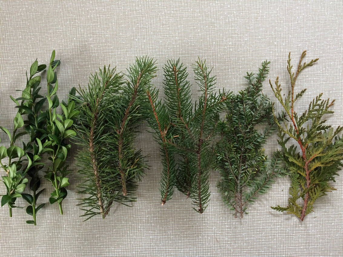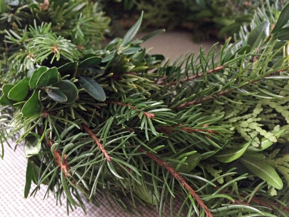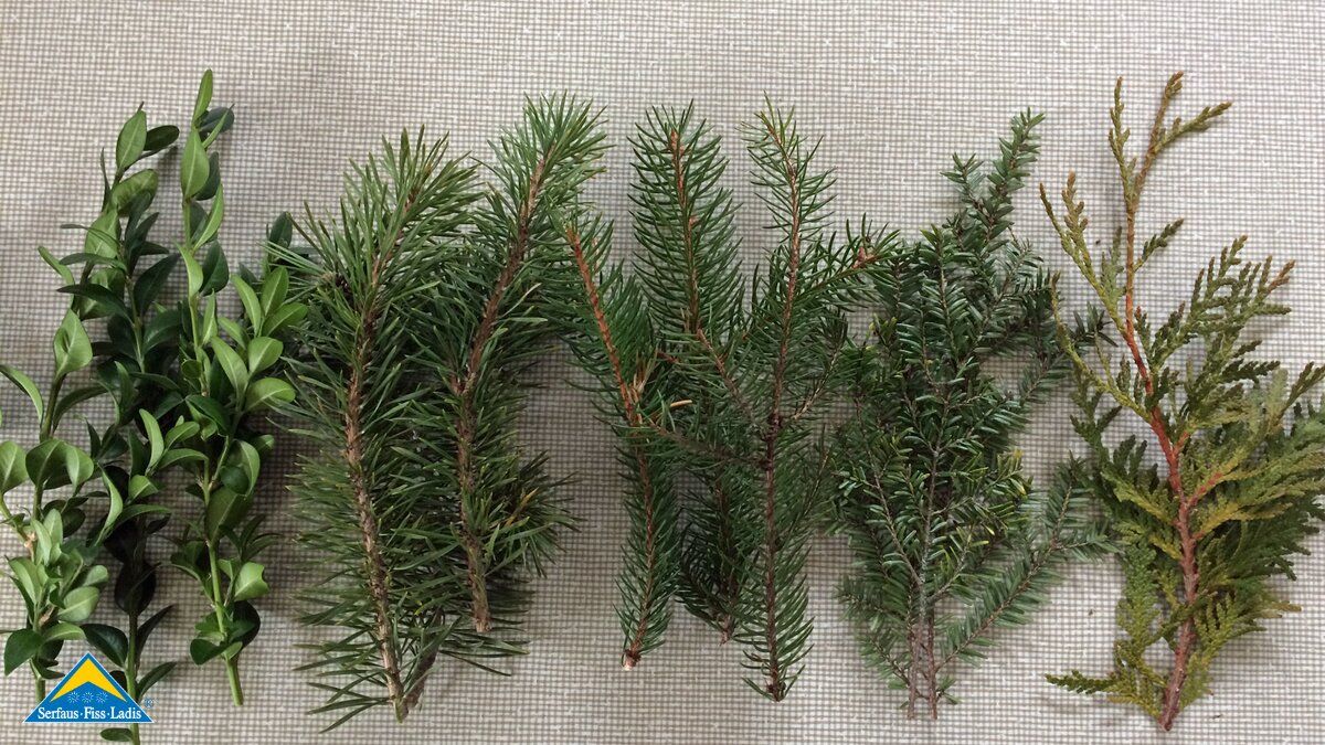 Hier sind der Kreativität keine Grenzen gesetzt. Gemischtes Grün macht sich gut. Gerne kann hier natürlich ganz klassisch mit Tannengrün gearbeitet werden. Ich bevorzuge aber das Spiel mit unterschiedlichen Strukturen und Farben. Neben den klassischen Tannenzweigen nahm ich Buchs-, Föhren und auch Thujenzweige. Die Länge der Zweige ist Geschmackssache. Je länger die Zweige sind, umso buschiger wird der Kranz.