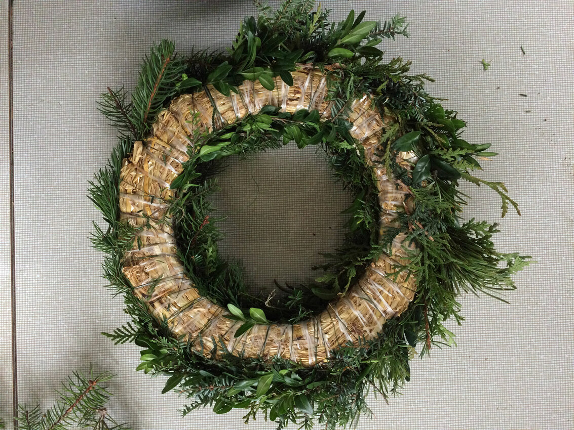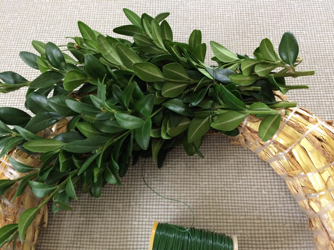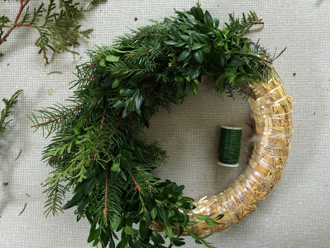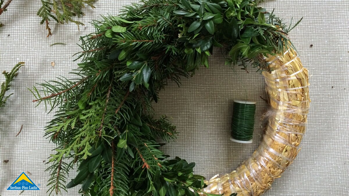 Das nächste Bündel etwas versetzt über die bereits befestigten Zweige legen. Die Richtung ist dabei egal. Immer fleißig und sauber weiterarbeiten, bis der Kranz komplett mit Grün bedeckt ist.