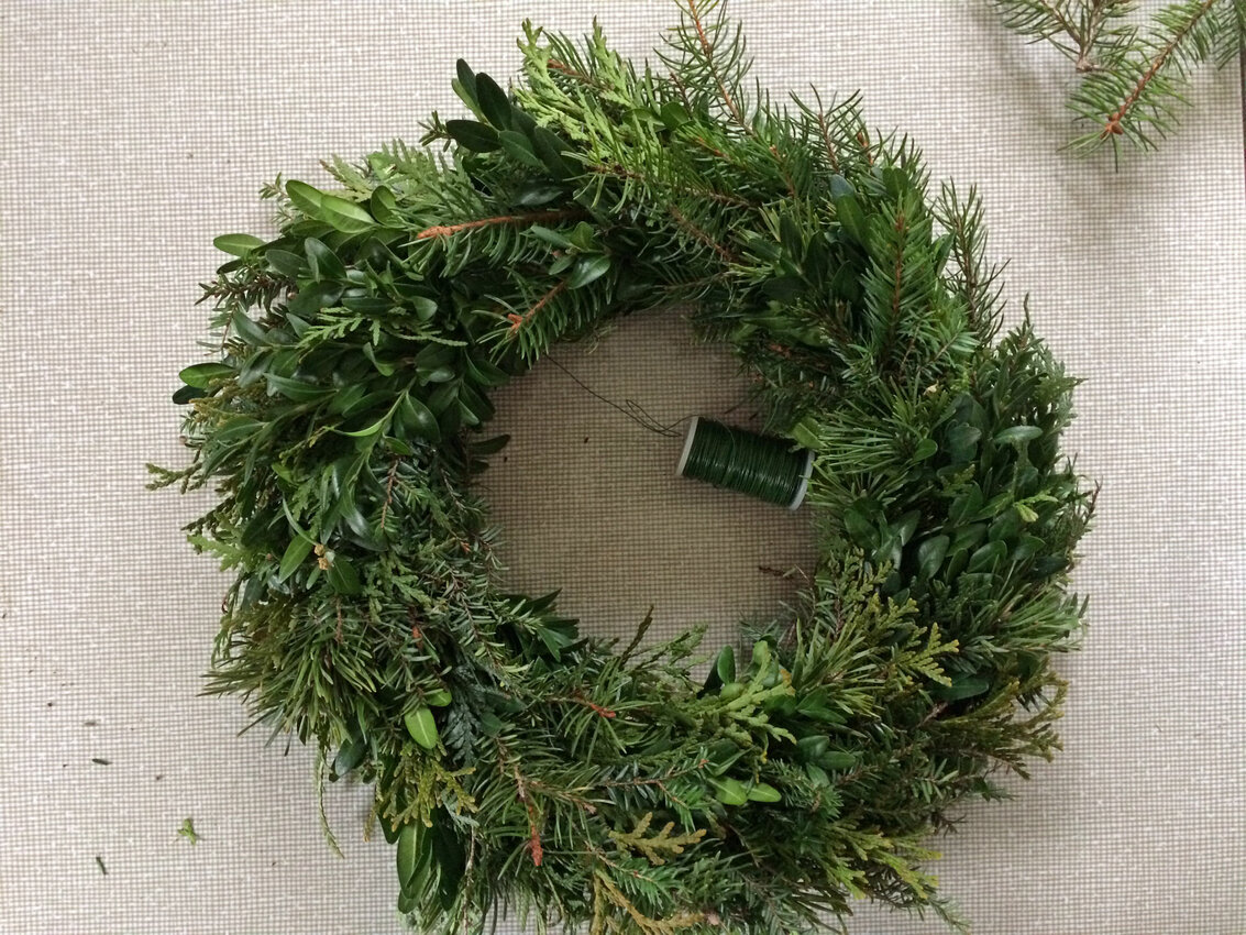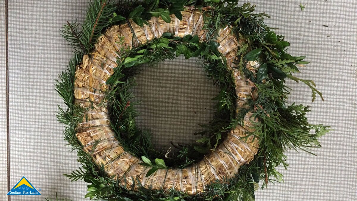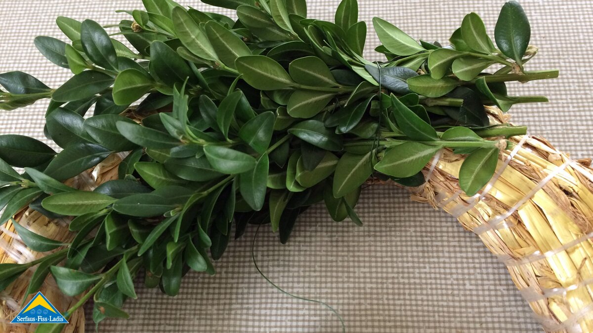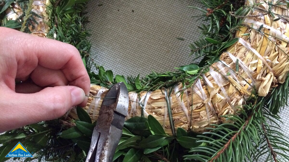 Anschließend die Zweigenden mit grünem Draht am Kranz befestigen, fest anziehen, damit nichts verrutscht. Den Kranz unten frei lassen, dafür jedoch oben und seitlich reichlich bedecken, bis der Kranz nicht mehr sichtbar ist.