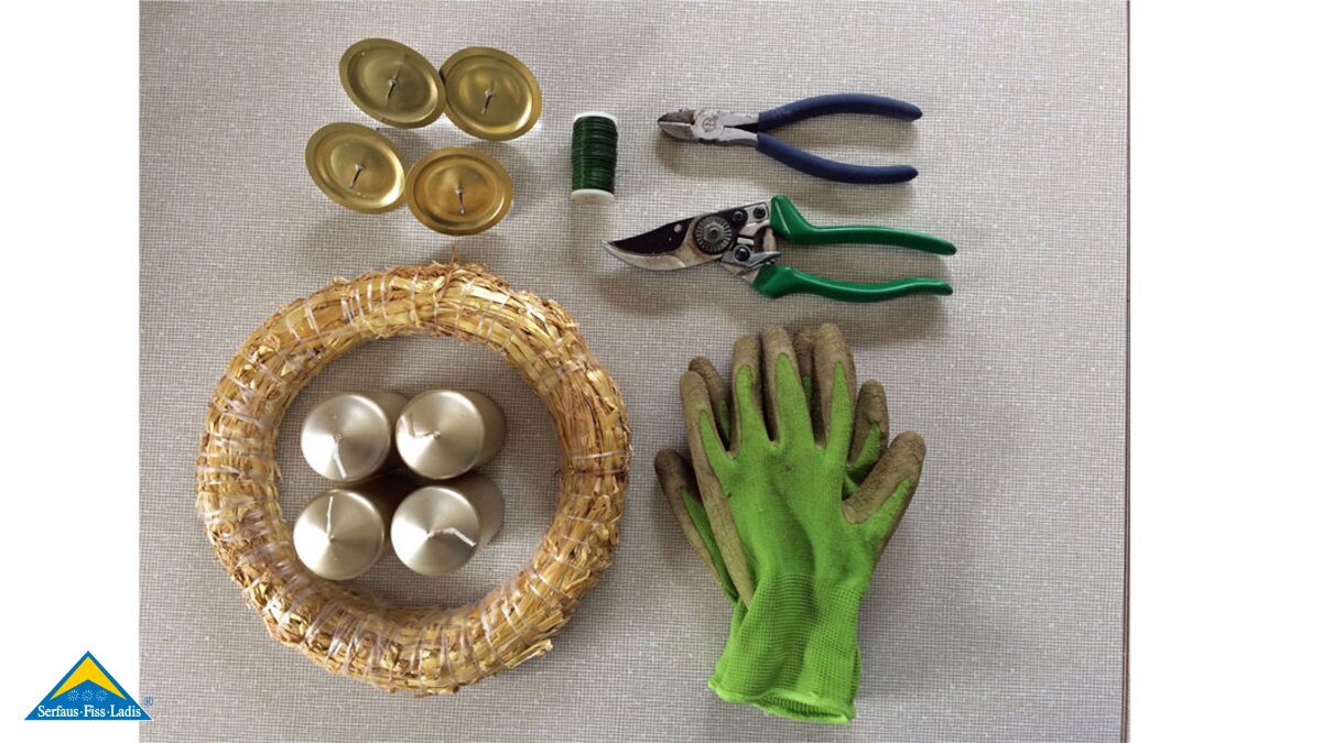 Bevor ich mit dem Basteln starten kann, benötige ich neben den Adventzweigen noch weitere Materialien für den "Adventkranz made by Andrea". Auf meinem Basteltisch liegen folgende Utensilien: