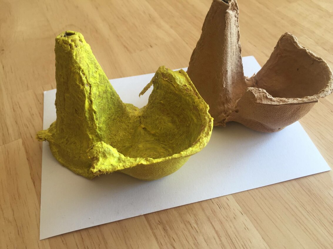 Die SFL-Hühner bekommen schließlich auch noch Flügelchen auf jeder Seite. Dafür schneidet man aus gelbem oder orangenem Tonpapier Flügel aus und klebt sie seitlich auf den Eierkarton auf.