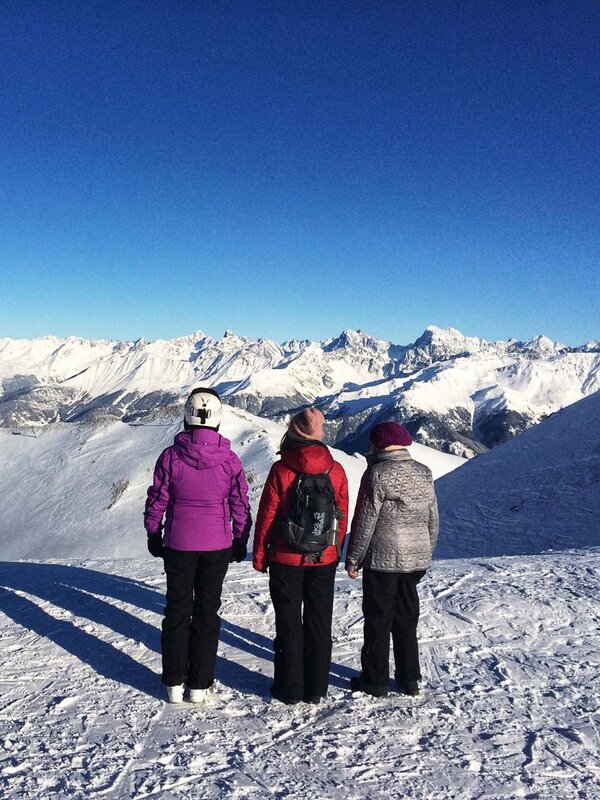 Elmar, unser Pistenbully-Fahrer, parkte sein PS-Wunder an der Talstation der Pezidbahn. Während wir auf den Kettenbändern zur Talstation ratterten, fuhr auch meine Mutter auf ihren Brettern zur Gondelstation. Anschließend gondelte die gesamte Gruppe die etwa 450 Höhenmeter hinauf auf den Pezid. Höher ist nur der Masnerkopf (2.828 m), auf den die Wintersportler befördert werden. Aber auch auf dem Pezid war der Panoramablick einfach magisch. Oma, Mama und Enkelin genossen die wunderbare Aussicht und den furchteinflößenden Blick auf die schwarze Pezidabfahrt.