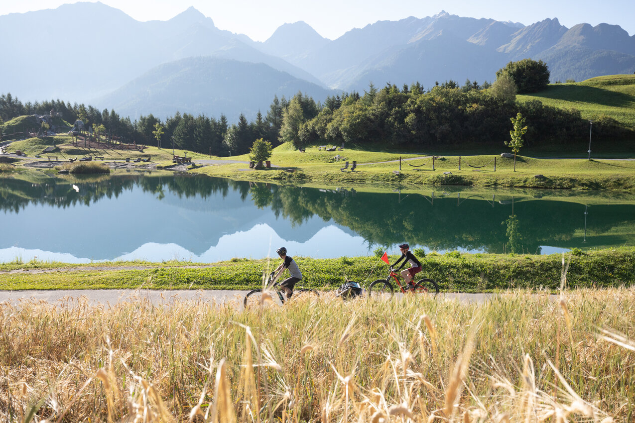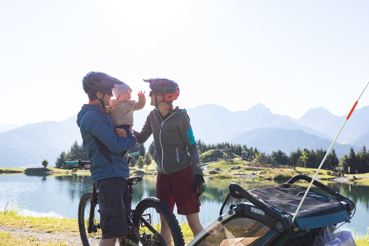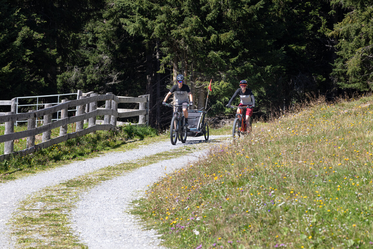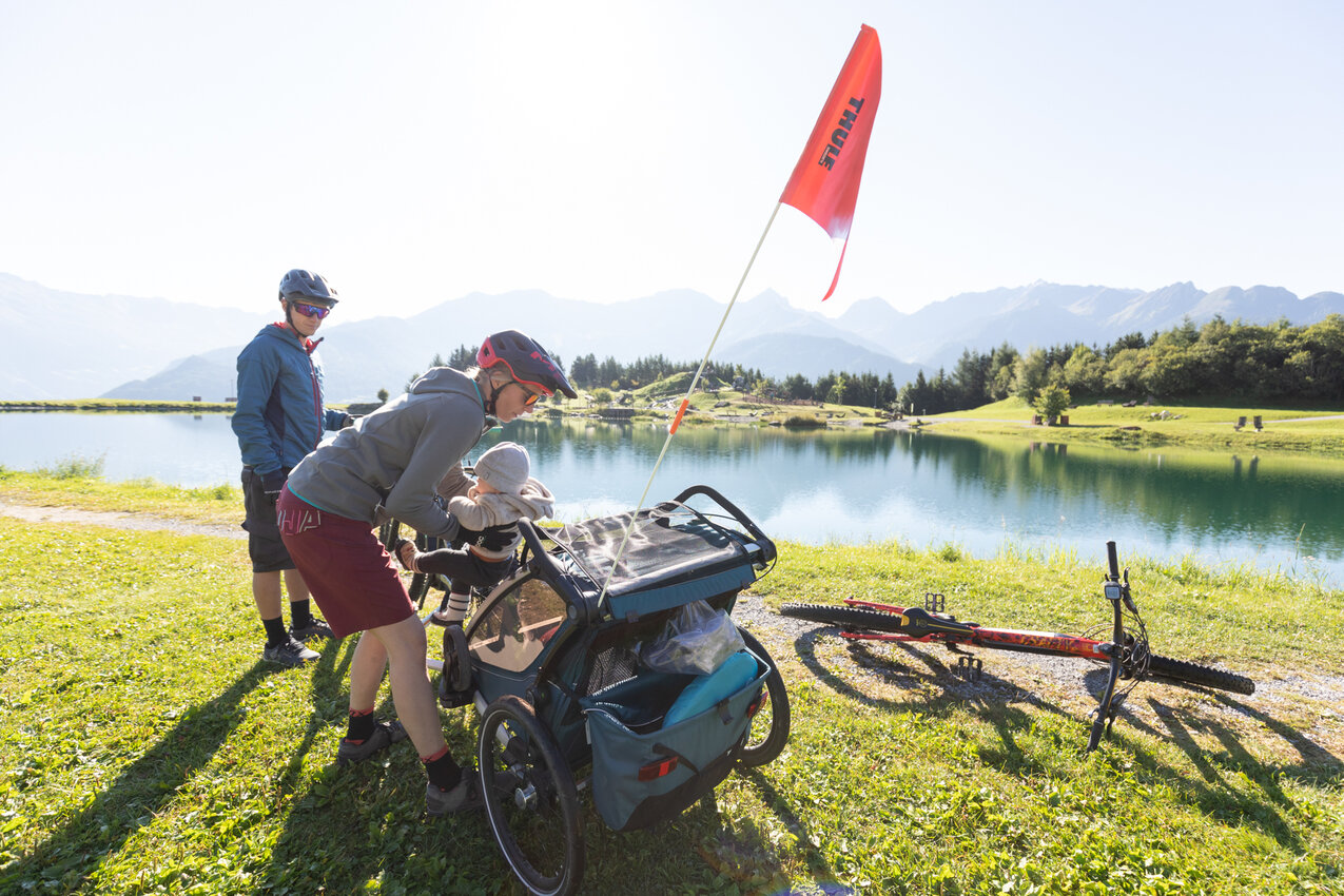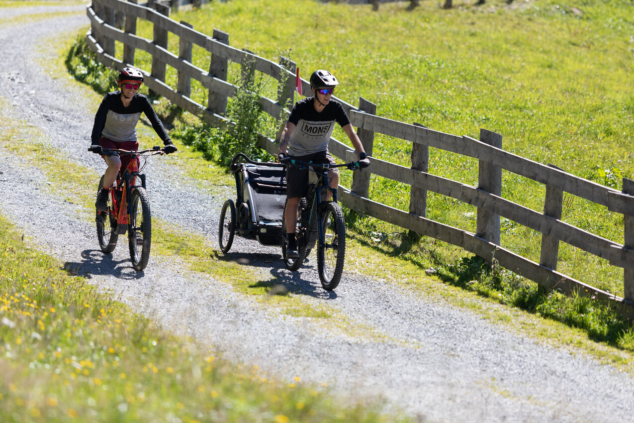 In der Region Serfaus-Fiss-Ladis gibt es zahlreiche FAMILIENFREUNDLICHE Ziele, die du mit deinem Bike gut erreichen kannst. Auch mit Kleinkindern, die noch nicht selber am Sattel sitzen können, kannst du mit einem Radanhänger problemlos Radausflüge am Hochplateau unternehmen. Beachten solltest du allerdings, dass sich ein E-Bike mit Fracht dran dementsprechend anders verhält. SICHERHEIT steht beim Familienausflug immer an oberster Stelle. Wenn du achtsam fährst, dir Zeit nimmst und du ausreichend Pausen einbaust, steht einem schönen FAMILIENAUSFLUG eigentlich nichts mehr im Wege. Bleib sportlich!