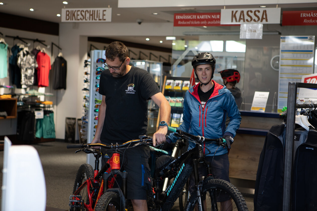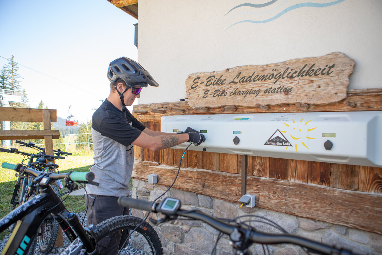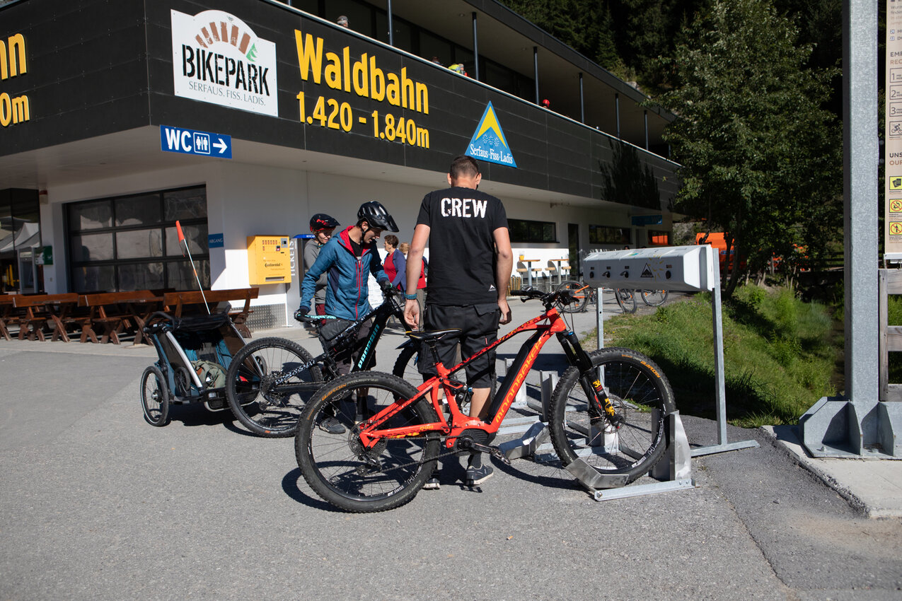 Sehr praktisch ist auch die APP BIKE ENERGY. Eine Übersichtskarte hilft dir beim Finden der nächsten Ladestation. Eine befindet sich beispielsweise direkt beim Bikepark Serfaus-Fiss-Ladis. Im Shop kannst du übrigens auch gleich E-Bikes ausleihen. Crew-Mitglied Christian hat uns sogleich eine schnelle Einführung erteilt. Wichtig: Das Ladekabel bekommst du direkt beim E-Bike-Verleih. Bei den Stationen befinden sich nämlich keine Ladekabel.