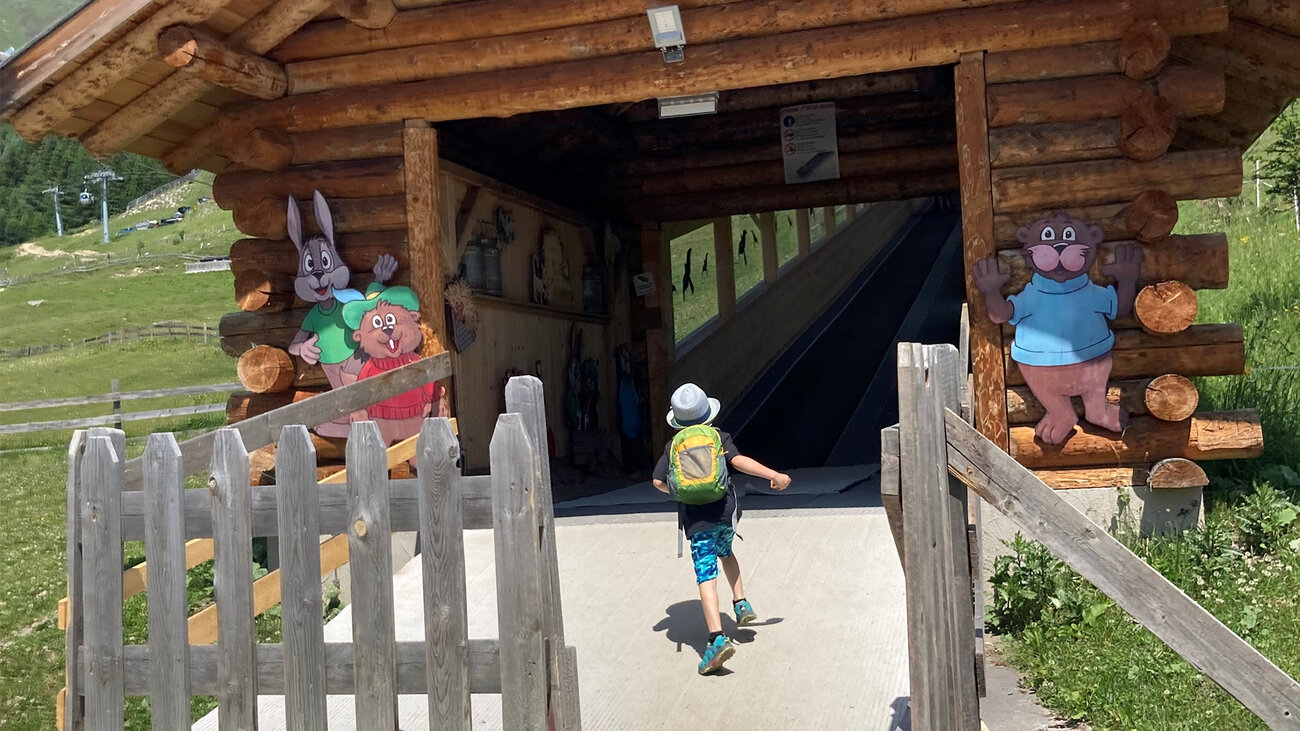 Am Vormittag fuhren wir mit der U-Bahn durch das Dorf Serfaus zur Talstation und von dort aus ging es mit der roten Gondel - der Alpkopfbahn - hinauf auf den Berg. Auf dem Weg von der Bergstation der Alpkopfbahn Richtung Lazidbahn stießen wir auf beeindruckende Bärenskulpturen in verschiedenen Größen. Diese boten sich perfekt für Fotos an und wir ließen uns die Gelegenheit nicht entgehen, einige Erinnerungsbilder zu machen. Durch diese angenehme Unterbrechung verging der kurze Spaziergang zur Talstation der Lazidbahn viel schneller, als wir es erwartet hatten. Innerhalb kürzester Zeit befanden wir uns nach einer weiteren Fahrt auf über 2.000 Metern Höhe.