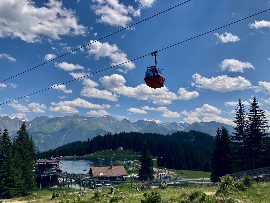 Von dort aus schlenderten wir gemütlich und immer noch voller Motivation Richtung Erlebnispark Hög. Der breite Schotterweg ist ideal für Kinderwagen geeignet und führt in etwa 15 bis 20 Minuten zum Högsee. Am Seeufer angekommen, gönnten wir uns ein köstliches hausgemachtes Eis von der nahegelegenen Seealm Hög – ein Genuss, der nach einem erlebnisreichen Tag natürlich nicht fehlen durfte. Anschließend traten wir mit der Gondel den Rückweg ins Tal an.