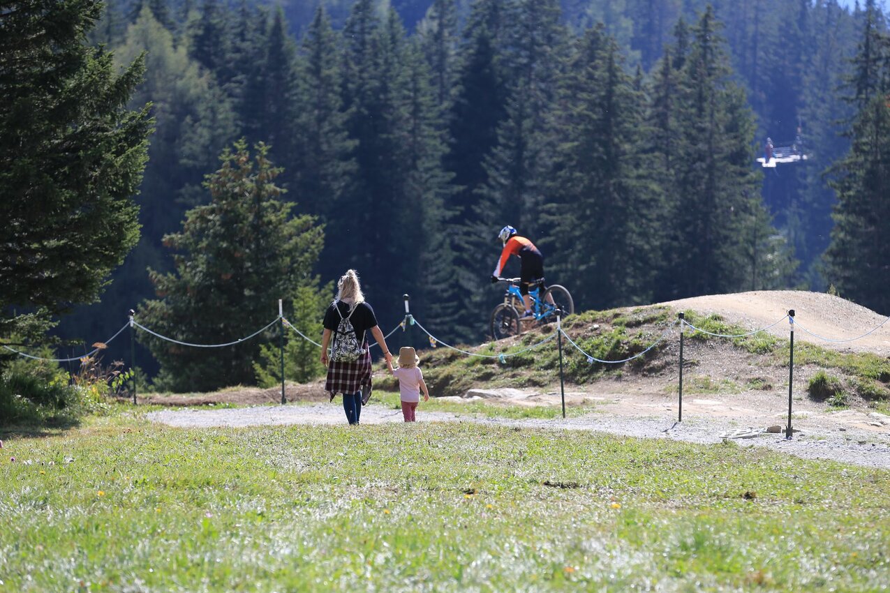 “Goti, Beerla!“ Die Kinderaugen leuchten fröhlich als sie die Waldbeeren und prächtigen Blumen entdeckt. Natürlich lassen wir die Pflanzen stehen, da viele streng geschützt sind und in der freien Natur nicht gesammelt oder beschädigt werden dürfen. Bereits am Ende des Waldes offenbart sich eine eindrucksvolle Landschaft und auch das Ziel können wir schon sehen. Je weiter wir hinauskommen, desto mehr öffnet sich der wunderbare Blick in Richtung Fiss und Serfaus. An der Abzweigung bei dem Aussichtspunkt beschließen wir eine kurze Rast zu halten und dann noch weiter Richtung Waldbahn nach Fiss zu wandern, wo man wagemutige Downhiller beim Springen im Bikepark Serfaus-Fiss-Ladis beobachten kann. 1, 2, 3, looos! Antonia hat sichtlich Spaß daran und klatscht nach jedem Sprung.