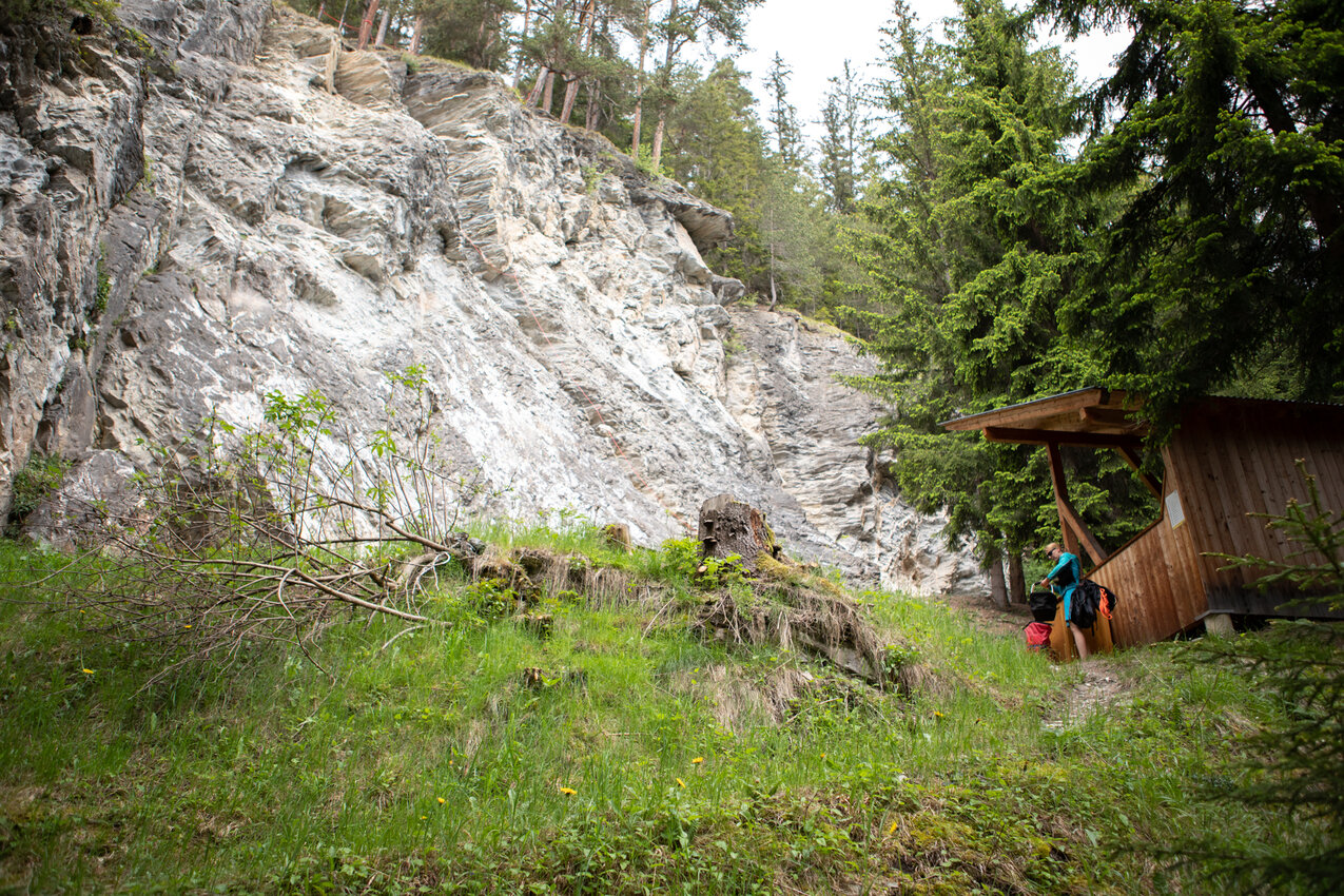 Was gibt es noch vor Ort? Ein überdachter HOLZPAVILLON mit Bänken bietet bei Regen und Sonne einen passenden Unterstand. Eine kleine Jause solltest du also unbedingt mitnehmen. Nach dem Klettern oder zwischen den Touren kannst du dort gemütlich verweilen.