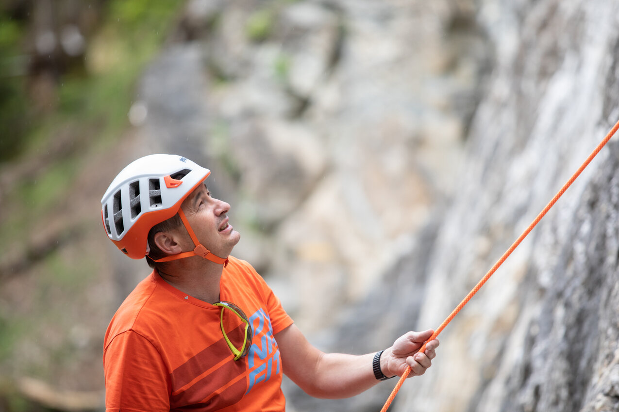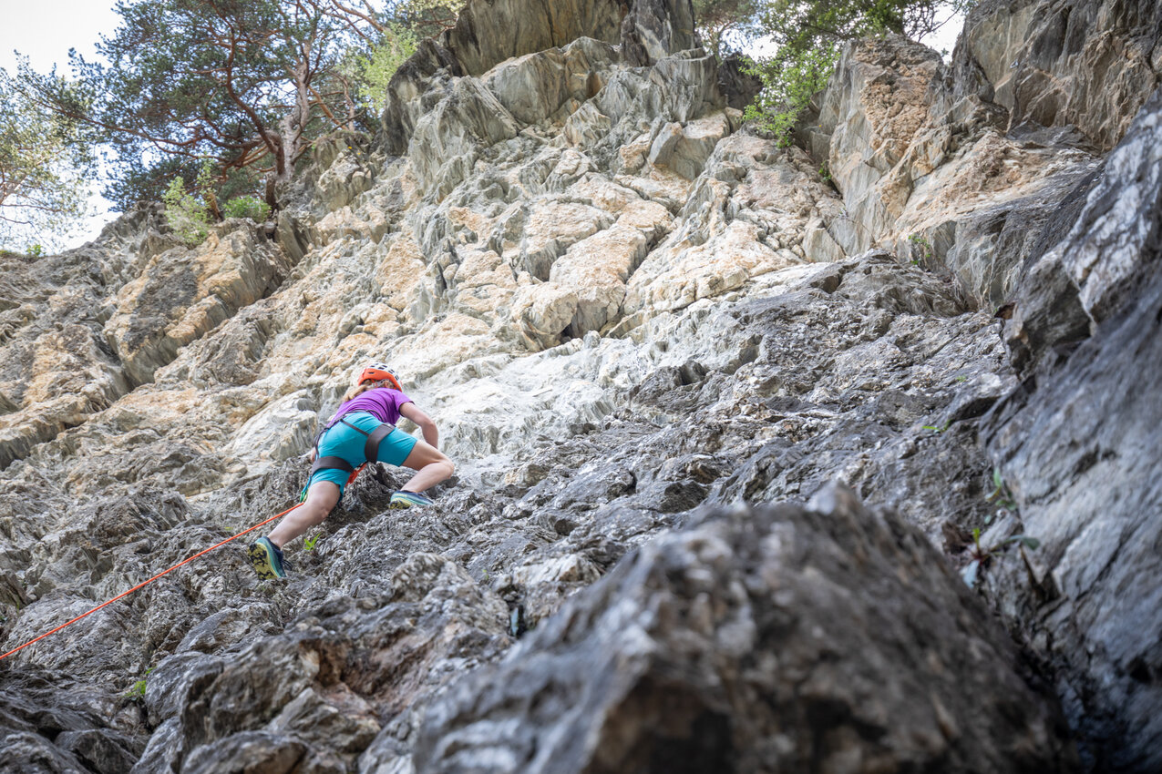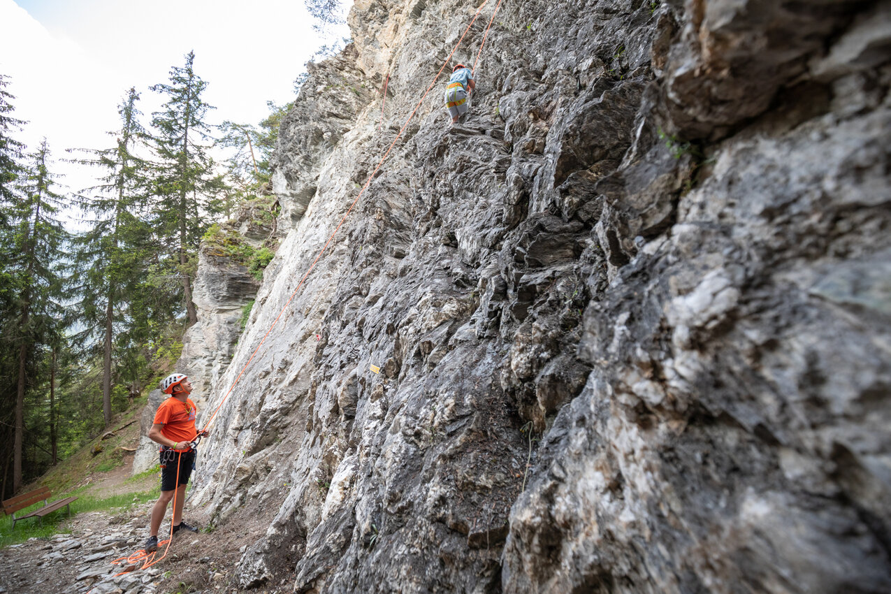 Damit meine Kids Anna (7) und Peter (10) entspannt den Felsen hinaufkraxeln können, erledige ich den VORSTIEG. So sind sie gut von oben gesichert und können in der TOPROPE-Technik klettern. Klettern im Nachstieg ist sozusagen die risikoarme Form des Kletterlernens. Aufpassen muss man aber natürlich auch hier. Bei einem möglichen Sturz kannst du dich einfach ins Seil fallen lassen.