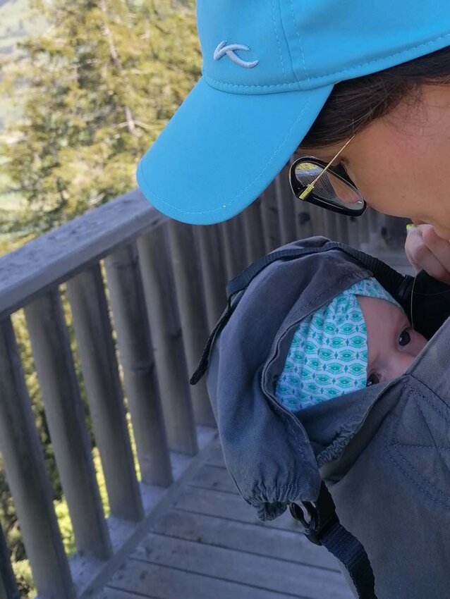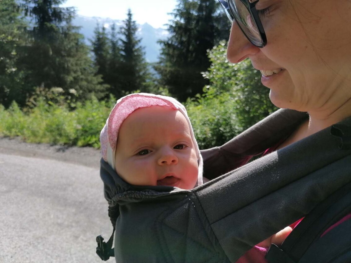 Von der Ferne ist bereits der Wodeturm zu erkennen. Der höchste Punkt unserer Wanderung ist erreicht. Der Blick hinunter ins Inntal begeistert uns alle. Unser kleiner Abenteurer macht mittlerweile ein Nickerchen und bekommt von dem grandiosen Ausblick leider nichts mit. Meine Tochter im Tragetuch hat nur Augen für mich. Das sollte sich aber bald ändern, da wir ja bald unser Mittagsrastplätzchen erreichen.