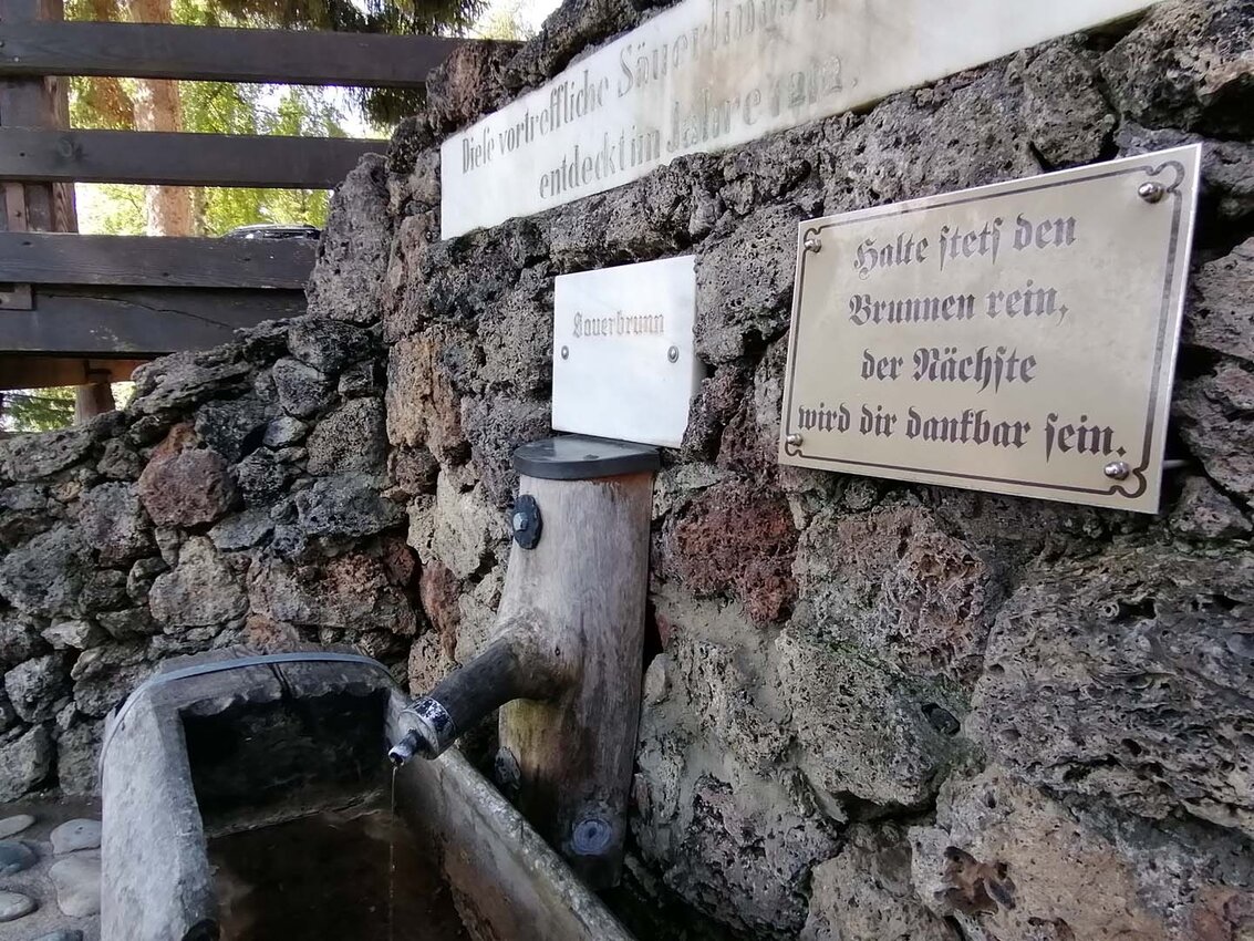 Vorbei an der Tuffgrotte geht es dann weiter zur Schwefelquelle, an der natürlich gekostet werden darf. Hast du das rötliche Bächlein auch entdeckt? Ein paar Schritte und schöne Ausblicke hinunter ins Inntal weiter, kommen wir dann direkt an der Sauerbrunnquelle in Obladis vorbei und erreichen somit das Ende des Themenweges. Die zwei Heilquellen entlang des Themenweges sind wirklich etwas Besonderes. Am Brunnen der Sauerbrunnquelle füllen wir unsere Trinkflaschen auf.