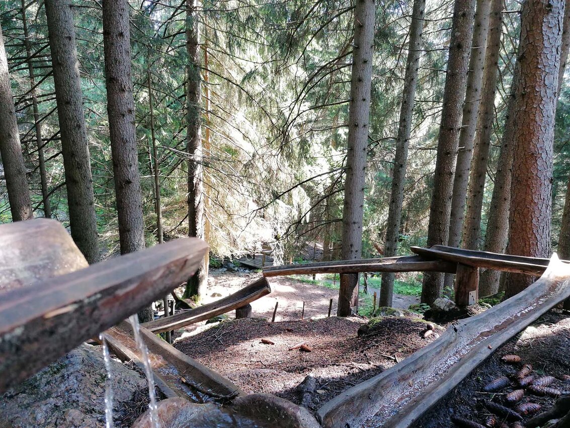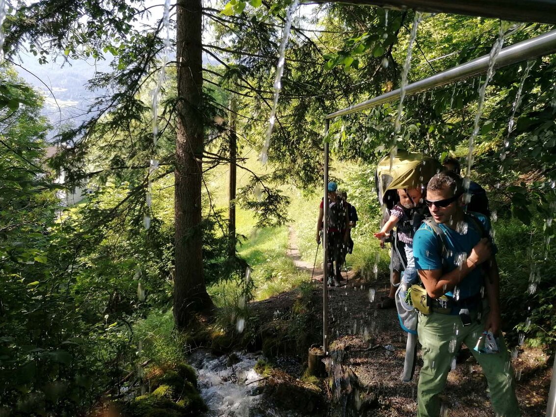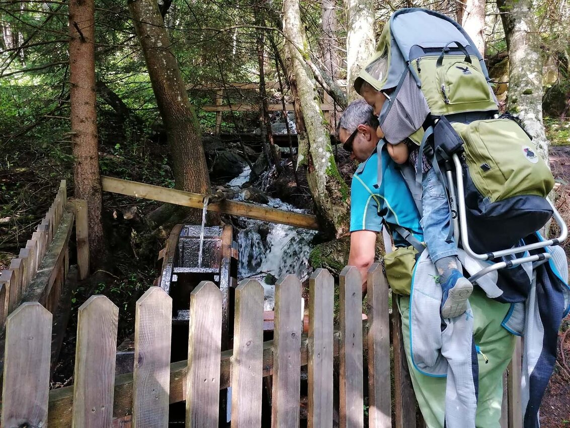 Der Weg führt uns zuerst vom Weiher in Ladis zum oberen Dorfbrunnen, mit dem großen Wasserrad dahinter, über den etwa 2 km langen Wasserwandersteig zur höher gelegenen Sauerbrunnquelle in Obladis. Wir wandern über sich windende Pfade durch den angenehm kühlen Wald, über kleine Brücken, vorbei an hölzernen Wasserrädern und Wasserbahnen und staunen wie Wassertropfen, wie ein Vorhang, heruntertröpfeln. Auf dem Themenweg erfahren wir beispielsweise wie die Kraft des Wassers für Mühlen genutzt wurde, genießen das Wandern über den weichen Waldboden und lauschen dem Rauschen des vorbeifließenden Bächleins. Mit jedem Schritt werden meine Energiereserven, die als Mama schon mal schnell leer sein können, aufgetankt.