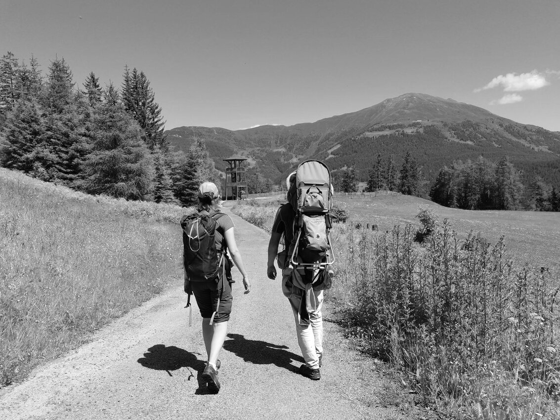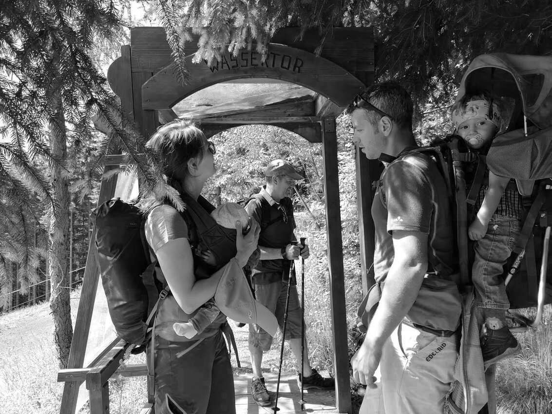 Mit Grillwürstchen, Holunderwasser, Windeln und Schnullern im Rucksack, stürzen wir uns um ca. 9.00 Uhr am Lader Weiher ins Wanderglück. Viel später würde ich die Wanderung zum Wodeturm nicht starten, so geht sich nämlich das Mittagessen beim Grillplatz neben dem Wodebad ohne Hast aus. Unsere Gesichter und die Sonne strahlen bereits um die Wette. Das Wetter spielt schon mal mit. Wir sind gut gelaunt und freuen uns schon auf einen genussreichen Mehrgenerationen-Wandertag. Mit meinen Eltern und meiner Schwester mit Freund an der Seite, ist der Ausflug sogleich stressfreier und entspannter. Helfende Hände kann man als Mutter von zwei Zwergen ja nie genug haben. Da ich bei meiner Wanderung meine Tochter ganz nah am Herzen trage, bin ich froh, dass ich einen Teil von meinem Wanderproviant bei den anderen Sommerfrischlern verstauen darf.