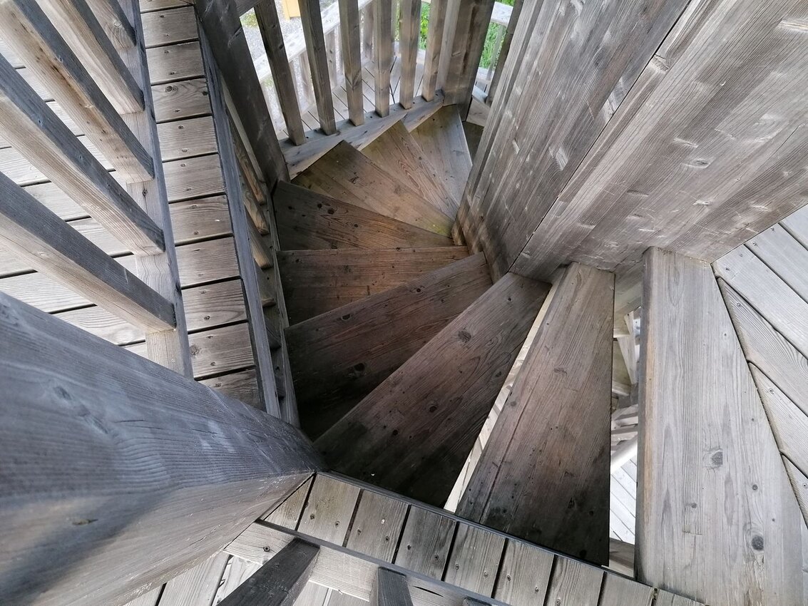 Gestärkt schreiten wir dann weiter auf dem Herrenweg und anschließend auf dem Wodesteig. Die Wege führen in leichter Steigung angenehm durch den Wald hinauf zum Wodeturm in Neuegg. Wir haben reichlich Zeit, die Natur zu genießen, ohne zu sehr aus der Puste zu geraten. Dennoch muss stets darauf geachtet werden, wenn man Kinder in der Trage oder Kraxe trägt, dass man trittsicher ist. Auch das Gewicht sollte man auf langen Strecken nicht unterschätzen. Die Wanderung nach Obladis bzw. Neuegg ist optimal. Sie ist nicht zu lang oder zu steil, führt meist durch den schattigen Wald und ist aussichtsreich. Das Auge wandert ja schließlich mit. Nach etwa einer Stunde sichten wir den hölzernen Wodeturm.