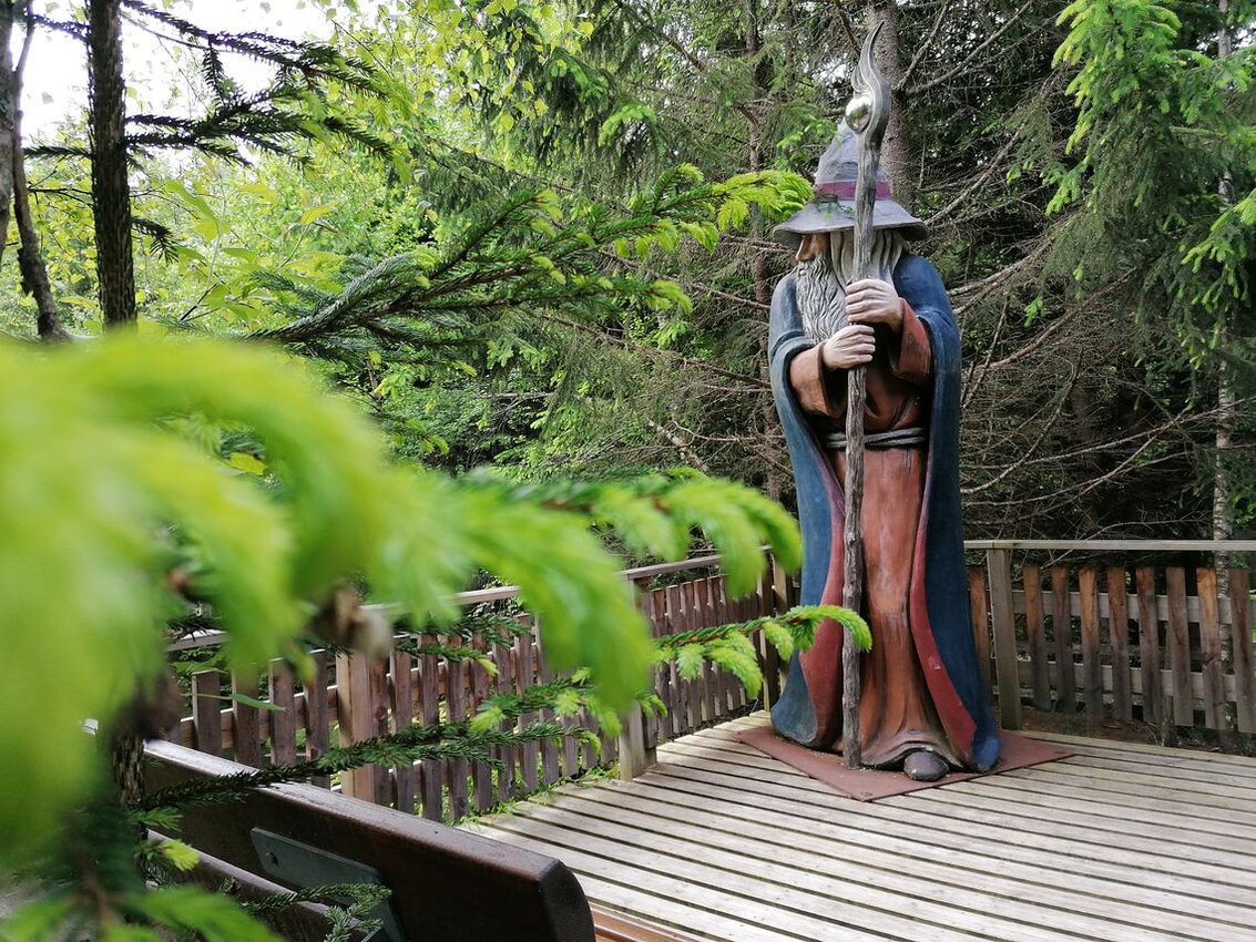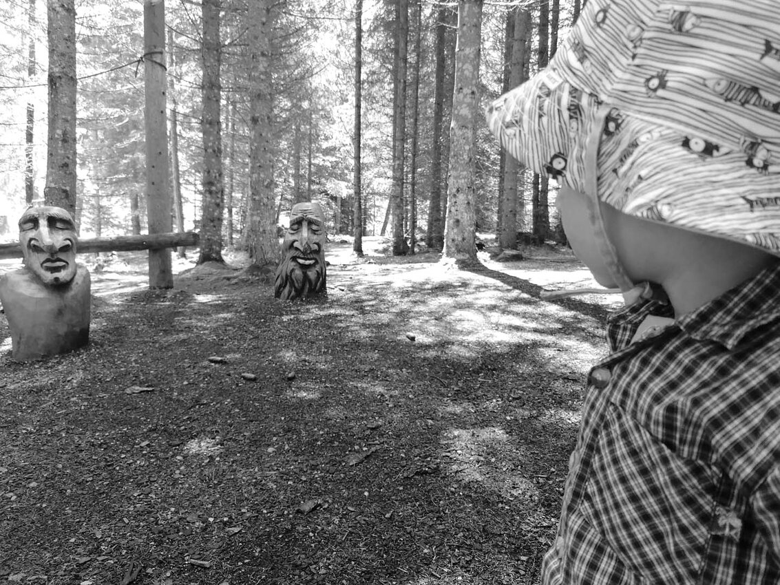 Ein paar Schritte weiter, tauchen wir in die Welt des Riesen Wode ein. Eine Riesenameise krabbelt über den Waldboden, bunte Pilze schießen heraus, lustige hölzerne Köpfe blicken die Besucher an, ein paar verschlungene Pfade laden zum Herumspringen ein … und der Riese Wode. Das Areal ist nicht allzu groß, aber sehr liebevoll gestaltet.