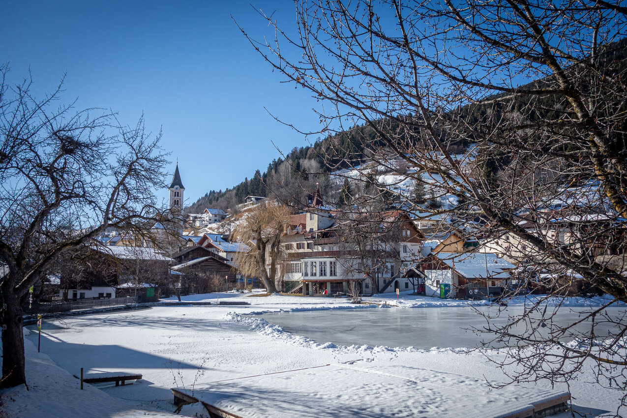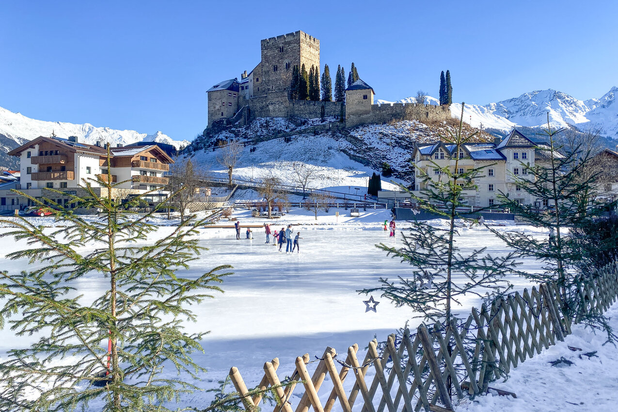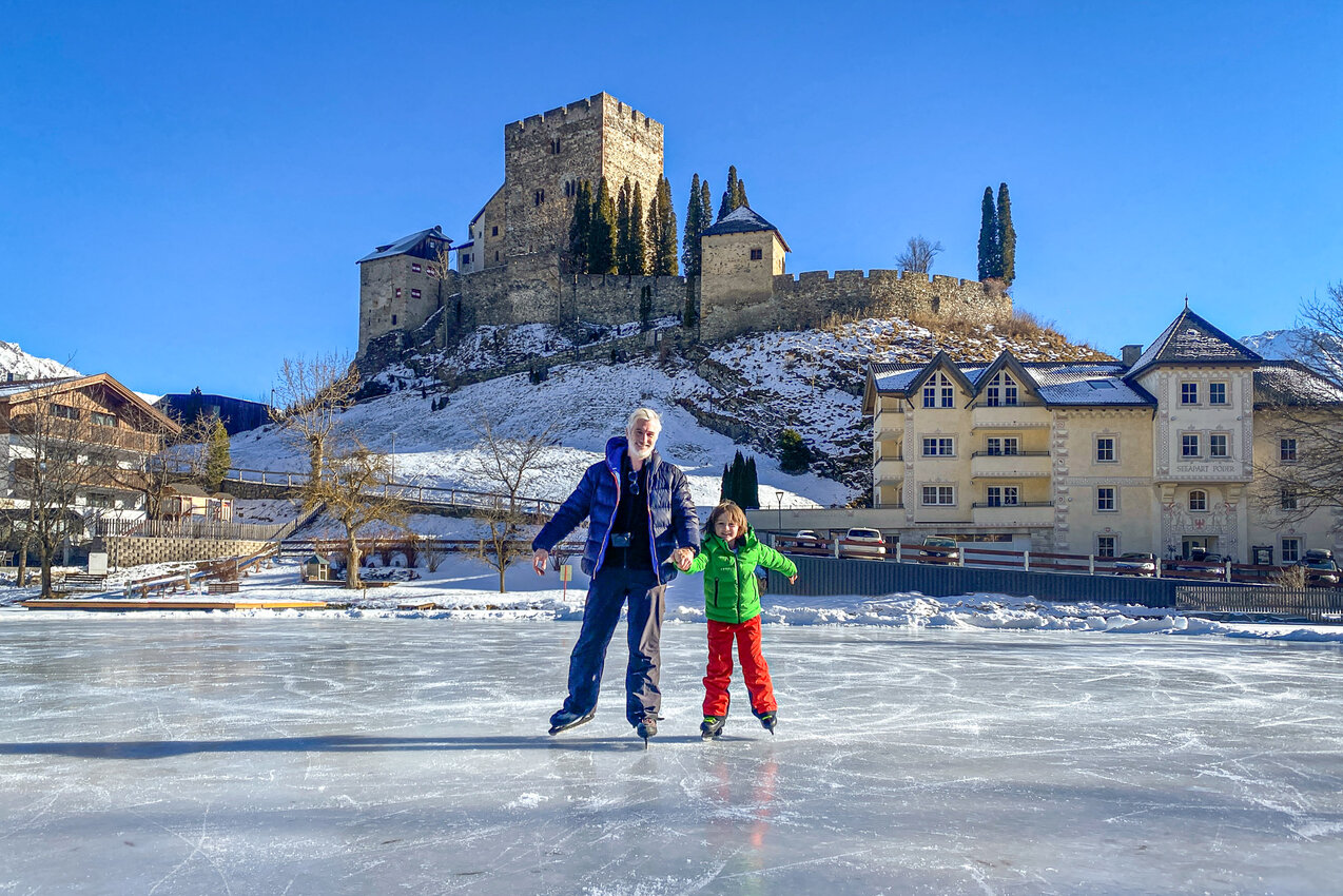 Unser Auto ist bereits gepackt. Es geht zurück in die Schweiz – doch nicht ohne Zwischenstopp. Denn schließlich sind aller guten Dinge drei: Nach dem Rodeln und Skifahren wollen wir noch Schlittschuhlaufen. Und das soll beim SCHLOSSWEIHER in Ladis besonders bezaubernd sein. Schlittschuhe leihen wir uns vor Ort gegen eine freiwillige Spende aus. Auch der Eintrittspreis ist freiwillig. Tim, der zunächst einen Flunsch gezogen hat, ist schnell in seinem (neuen) ELEMENT und fährt zwar langsam, aber zunehmend sicherer auf dem Eis umher. Was ihn nicht schert, mich aber umso mehr: das Panorama. Der Weiher wird nämlich umrahmt von historischen Häusern und einem Hügel, auf dem die BURG Laudeck thront. Schöner geht Eislaufen in Serfaus-Fiss-Ladis nimmer.