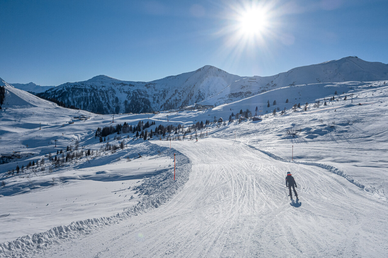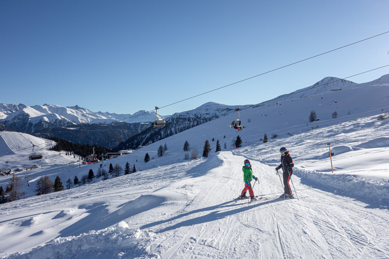 Wir bereuen es nicht. Der Schnee ist ein Traum, die Sonne strahlt vom blauen Himmel. Es ist perfekt. Und zwar für uns alle. Für Tim, der seinen dritten Skiwinter erlebt und auf den breiten Pisten nicht nur „Pizza“, also Stemmbogen fahren, sondern auch „Pommes Frites“, also PARALLELSCHWÜNGE üben kann. Da ich erst in meiner Jugend Skifahren gelernt habe, trage ich immer etwas Angst im Rucksack mit. Durch die großzügigen Pisten verfliegt diese Angst jedoch rasch. Und nicht zuletzt für meinen Mann, der zwar, ganz Schweizer, schon seit Kindesbeinen an auf den Brettern steht, für den auch die blauen Pisten nicht langweilig sind, sondern zum „schönen“ Fahren einladen. Einer der vielen Aufstiegshilfen wird schnell zu unserem Favoriten: die PLANSEGGBAHN, die von unterhalb der Bergstation der Komperdellbahn zum Plansegg hinaufführt. Oben starten mehrere tolle Pisten mit atemberaubender Aussicht.