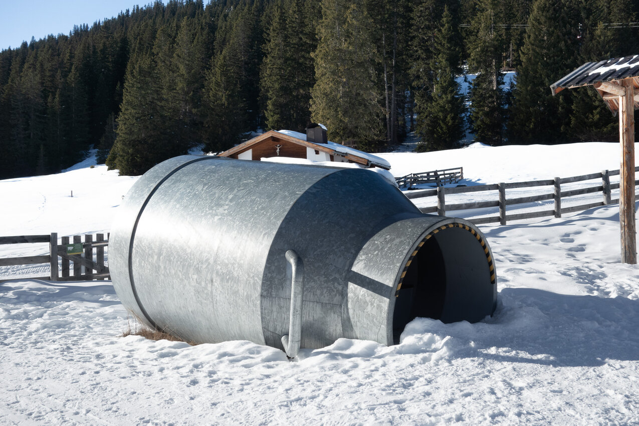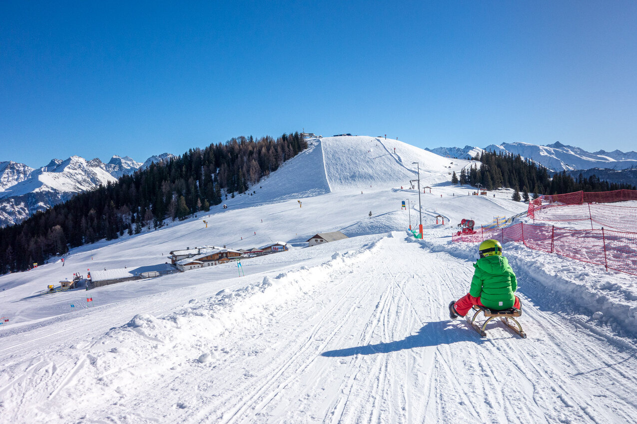 Wir wollen Ski fahren, aber nicht nur. Als Erstes fahren wir mit der Gondel zur Bergstation der Komperdellbahn. Hier, auf rund 2.000 Höhenmetern, leihen wir unsere SCHLITTEN aus. Eine unkomplizierte Angelegenheit. Die vier Kilometer lange Rodelbahn in Sefaus führt an der Kinderschneealm vorbei und hinab bis zu den Talstationen in Serfaus. Die Strecke ist für meinen Geschmack genau die richtige Mischung aus SPASS & ABENTEUER: nicht zu langsam und nicht zu schnell.